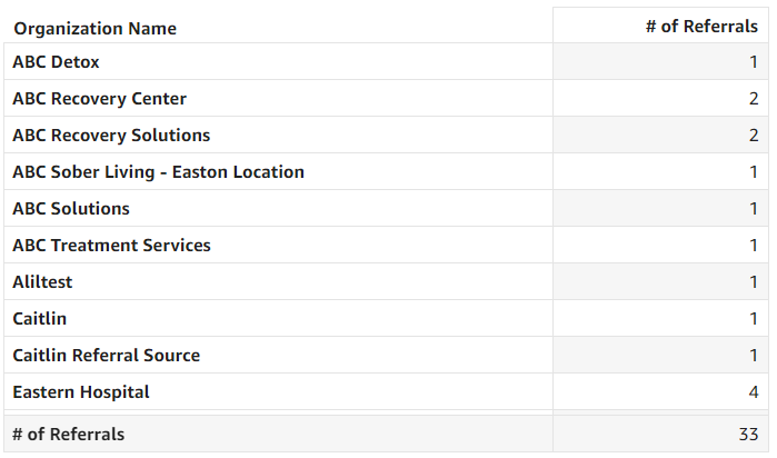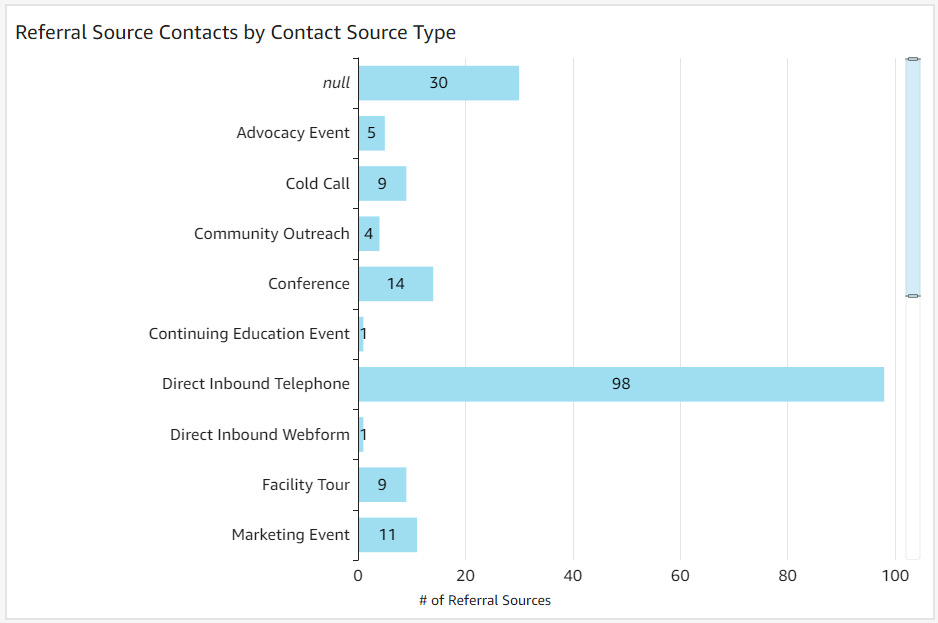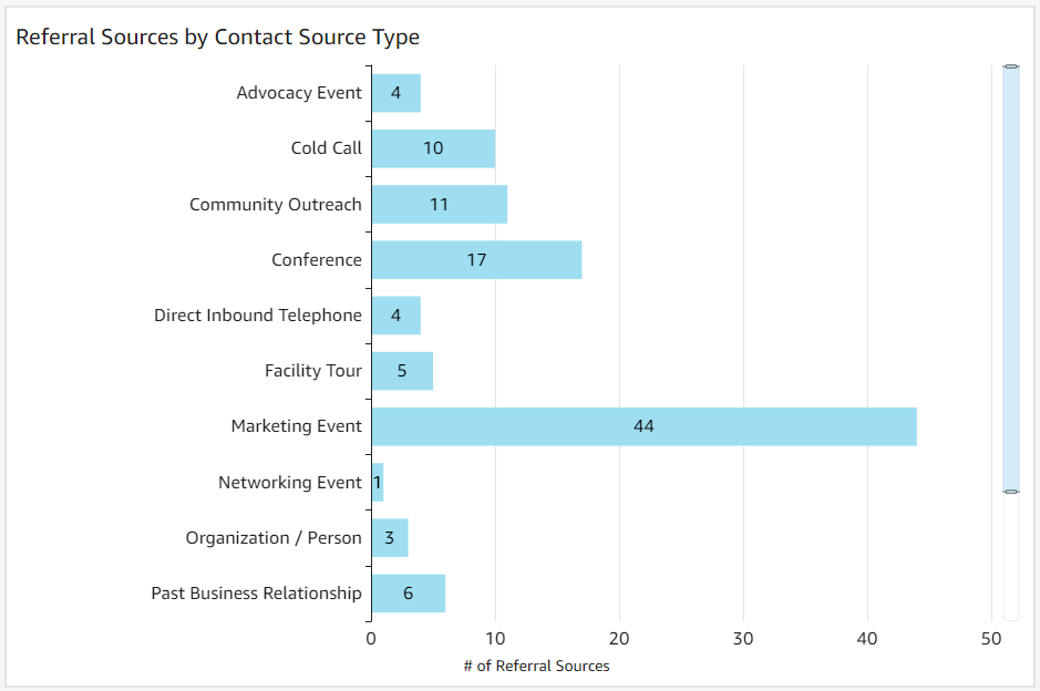 Referral Source Contacts by Contact Source Type: This graph displays the total number of referral source contact relationships, categorized by contact source type—essentially how each relationship was initiated or established. This breakdown helps users understand the origins of their referral source contact connections, providing insights into which methods of contact are most effective for building relationships.