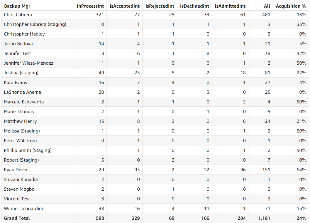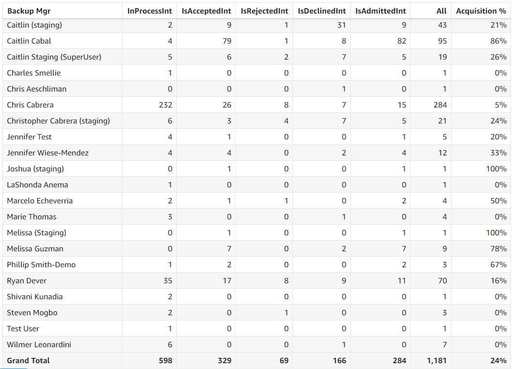 Treatment Opportunities by Contact Backup Relationship Manager: This grid presents a detailed breakdown of treatment opportunities associated with each Referral Source Contact Secondary Relationship Manager. The outcomes are classified as Rejected, In Process, Declined, or Accepted, based on the opportunity status.