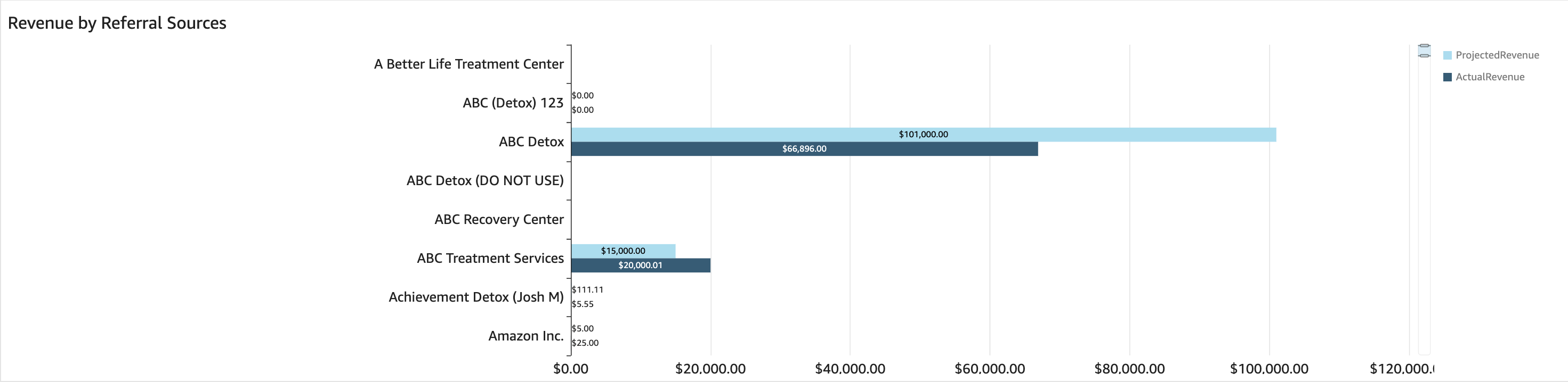 - Revenue by Referral Sources: This graph enables the comparison of Projected Revenue (Specifically, the Projected Insurance Revenue) against Actual Revenue. The data is sourced directly from the decision table in each treatment opportunity, providing a clear visual representation of revenue performance.