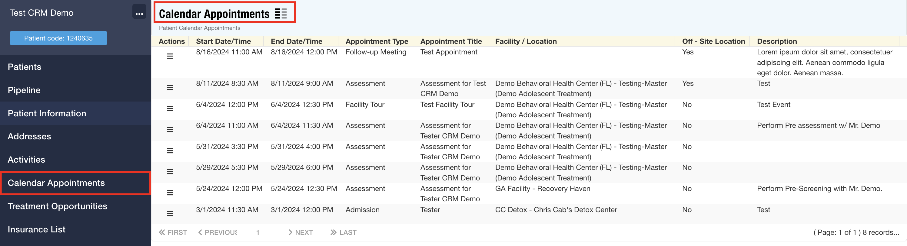Patient Records: The Patient Record UI has been updated with a new section where users can view and manage all calendar appointments associated with the patient. This section features a show/hide functionality, allowing users to control the visibility of specific data points for each appointment, ensuring a customizable and streamlined experience.