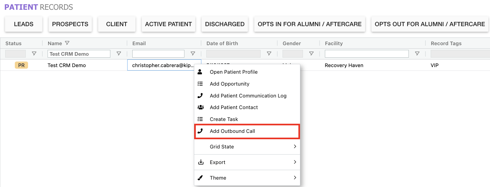 Prospect/Patient Records Grid: The right-click quick actions on the Prospect/Patient Records grid have been updated to include a new option for users to easily request an Outbound Call for the selected patient record. This new feature integrates with the system’s Outbound Call List, providing a seamless workflow for managing outbound communication.