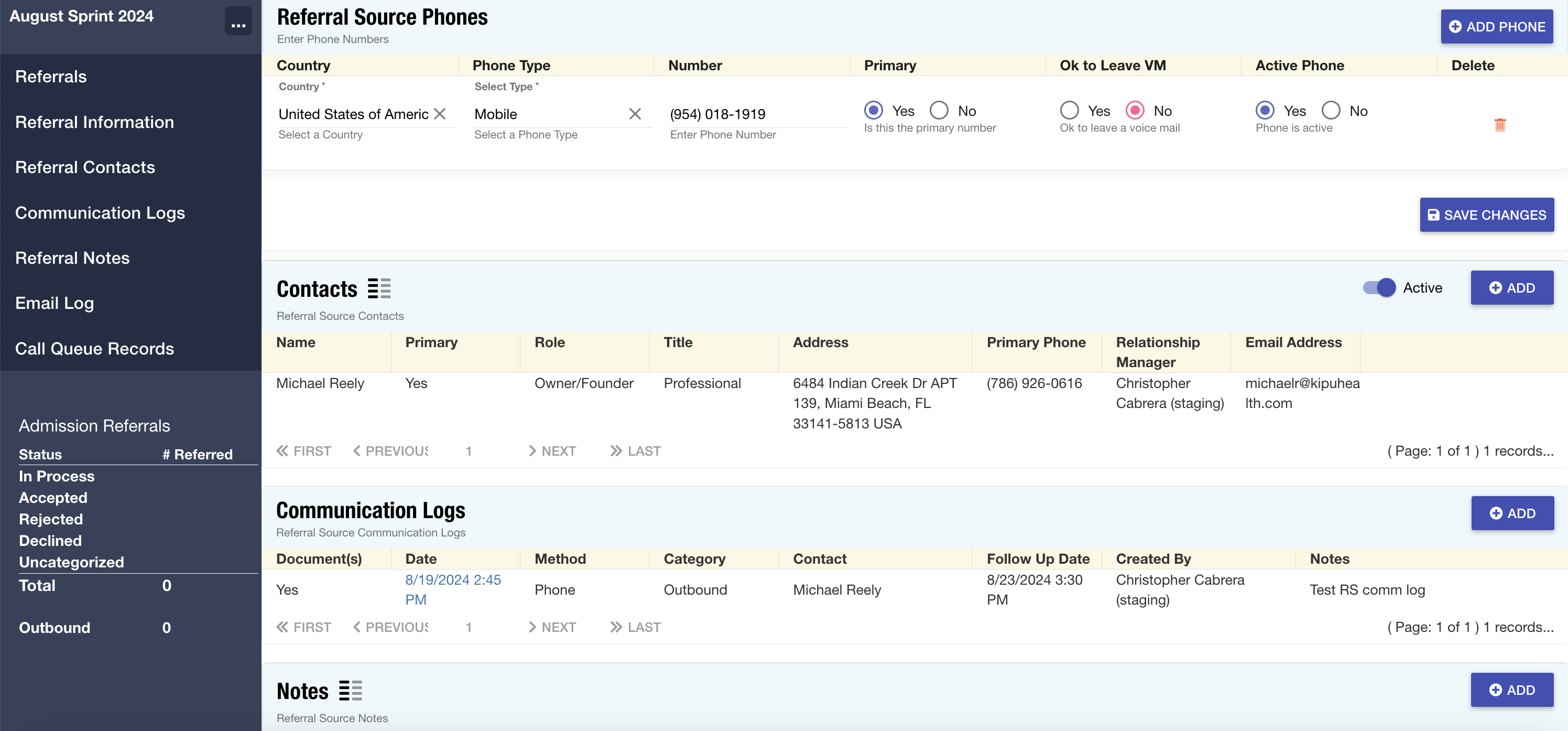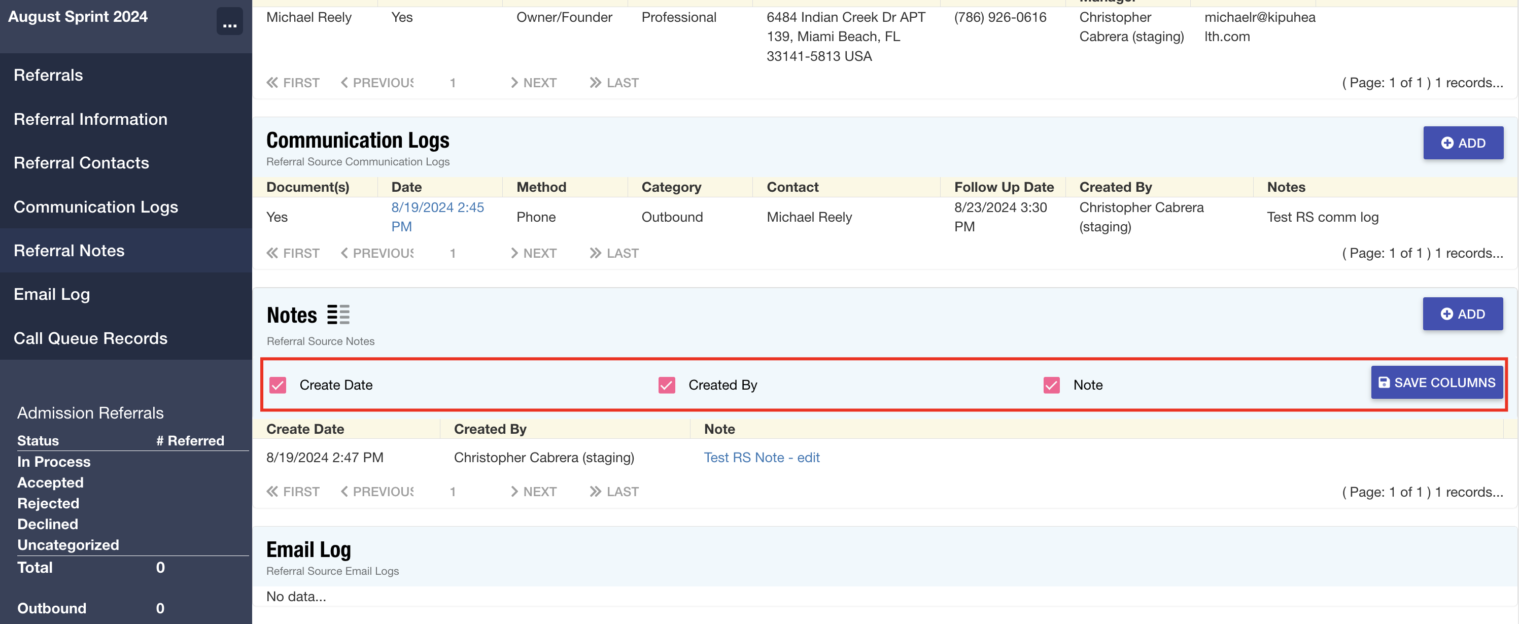 Referral Sources: The following sections of the Referral Source record have been updated to remove drop shadows and padding from the tables, ensuring a more uniform appearance that aligns with the rest of the site: Referral Information, Address, Phones, Contacts, Communication Logs, Notes, Email Logs, and Associated Call Queue Records.