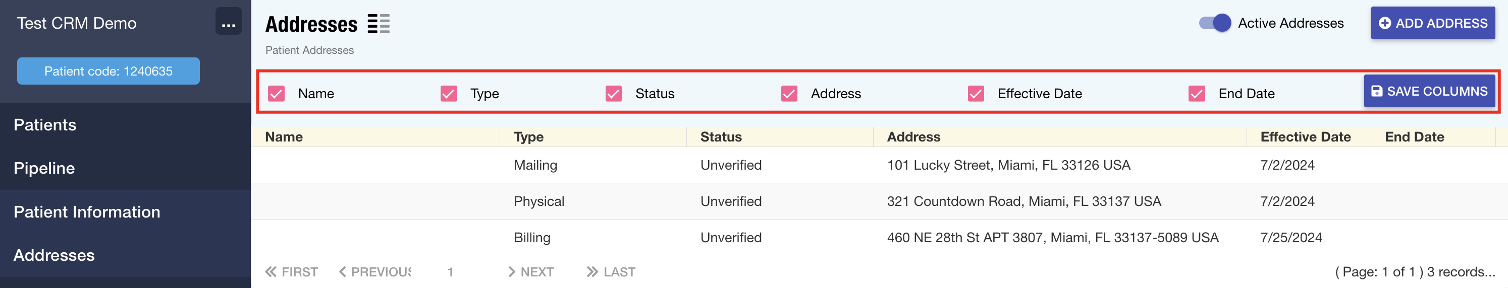 Patient Records: The Addresses section in patient records has been updated to include show/hide functionality, enabling users to customize which columns are displayed. This enhancement offers increased control and flexibility over how address information is presented.