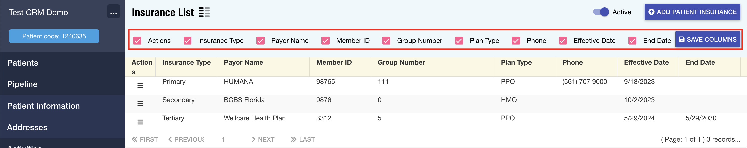 Patient Records: The Insurance List section in patient records has been updated to include show/hide functionality, allowing users to customize which columns are displayed. This enhancement provides greater control and flexibility over how insurance policy information is presented.