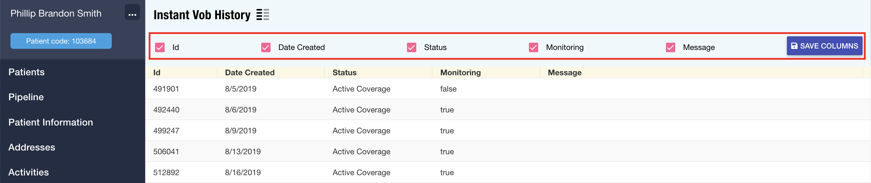 Patient Records: The Instant VOB History table in patient records has been updated to include show/hide functionality, enabling users to customize which columns are displayed for a more tailored view.