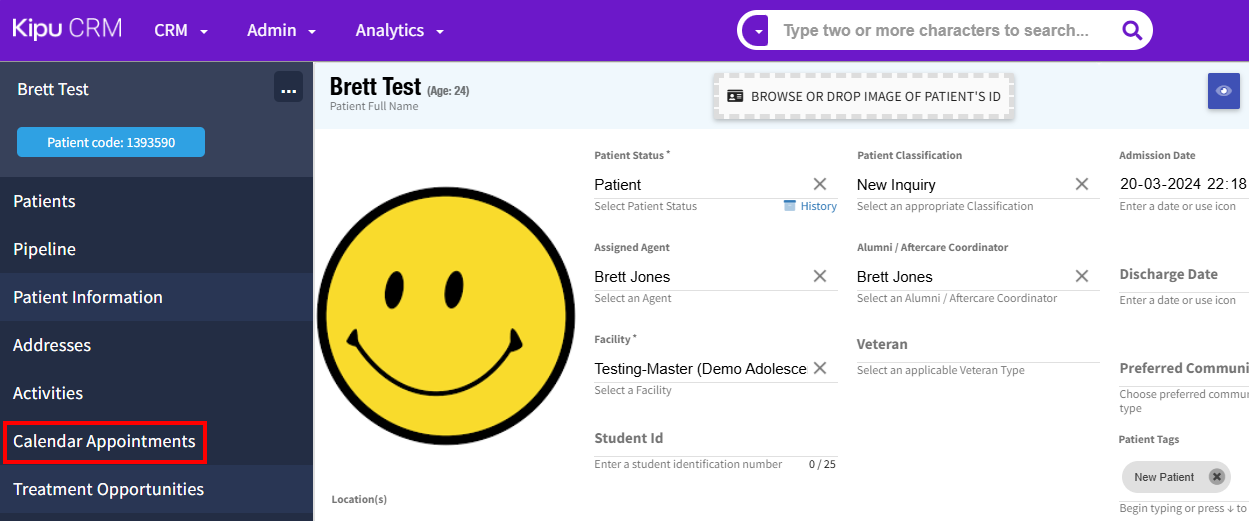 - Under Calendar Appointments, you will see a list of all the scheduled appointments for the patient.