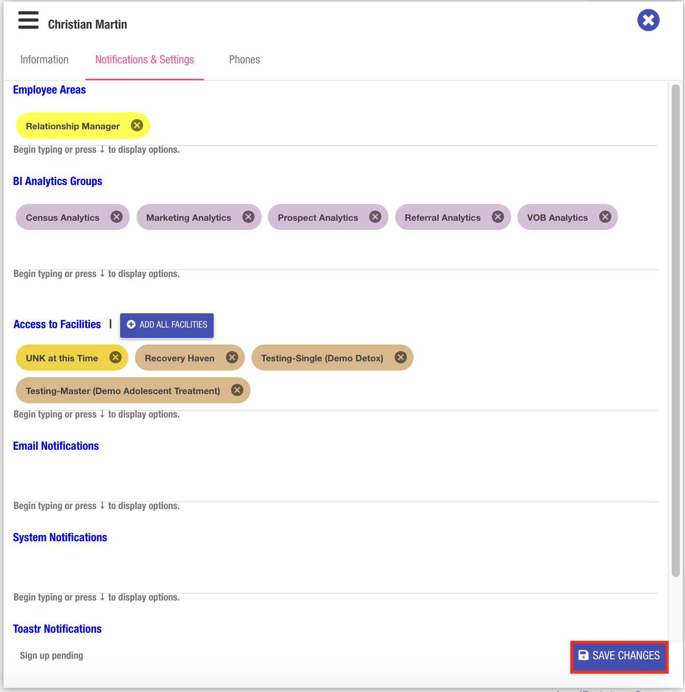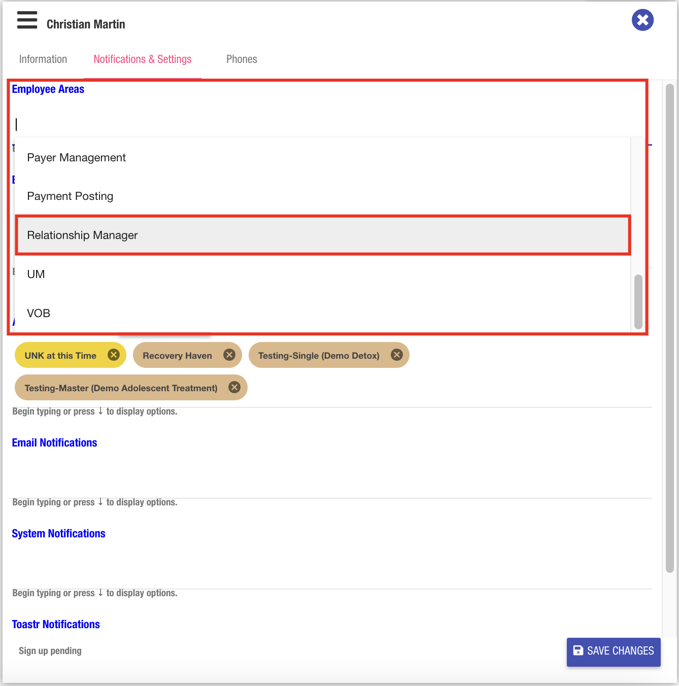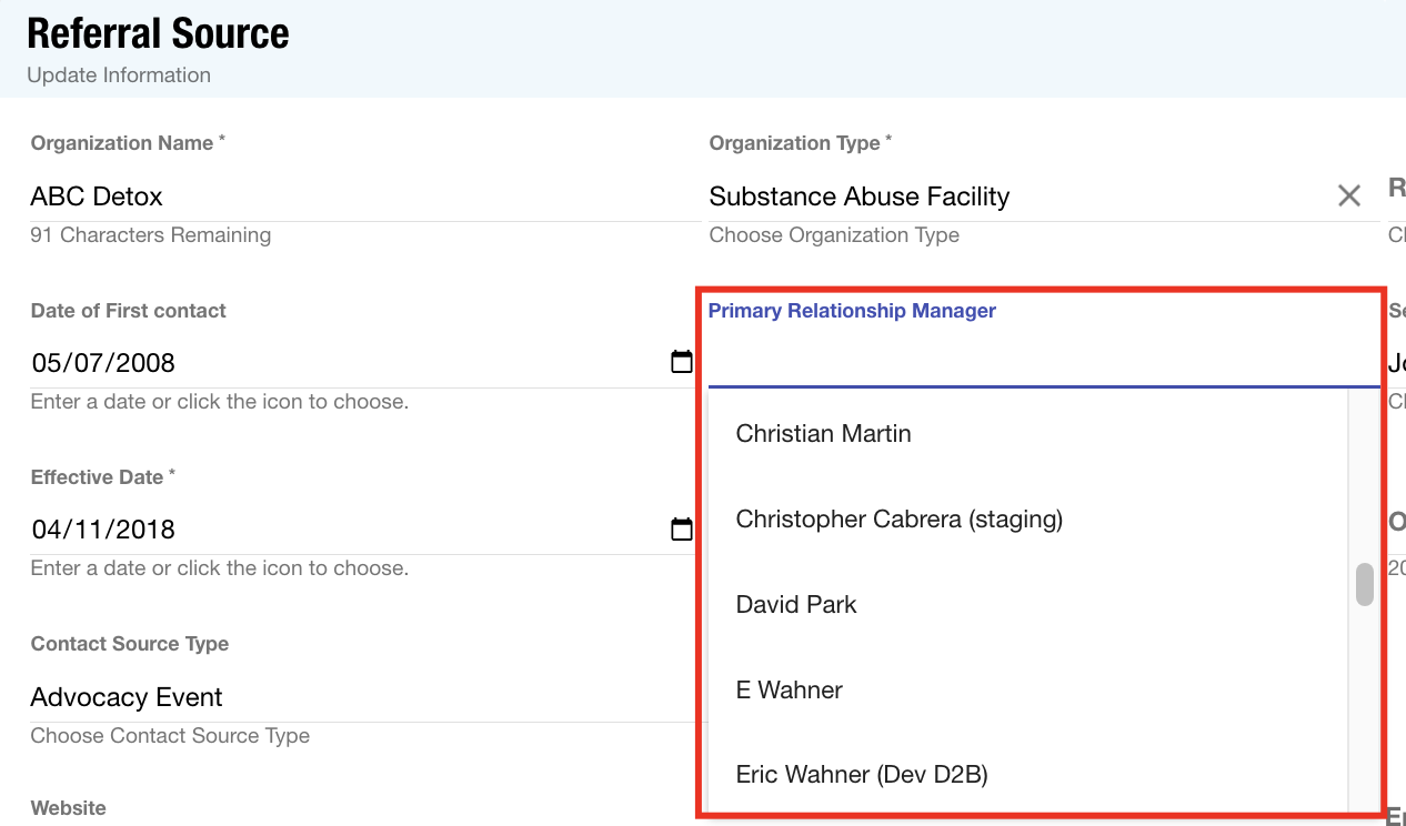 CRM users will not be available for selection in the Relationship Manager lists if their user profile does not include the required “Relationship Manager” employee area tag. This requirement allows Super Users to control the available options, helping to streamline the documentation process in referral source records.