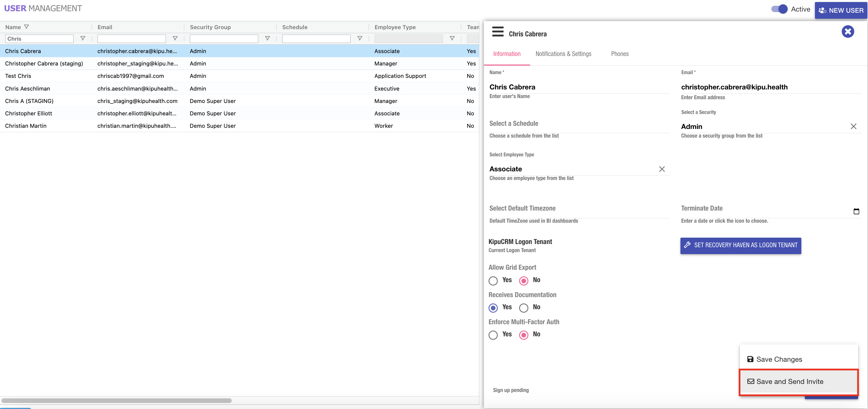 User Management: The user profile focus panel now includes a new “Save & Send Invite” option, making it easier to streamline the process of inviting new users.