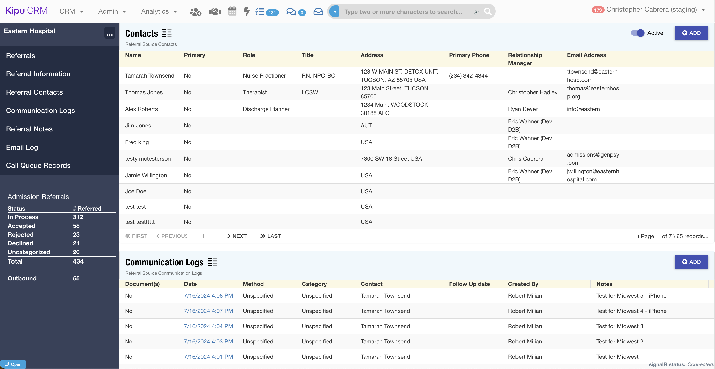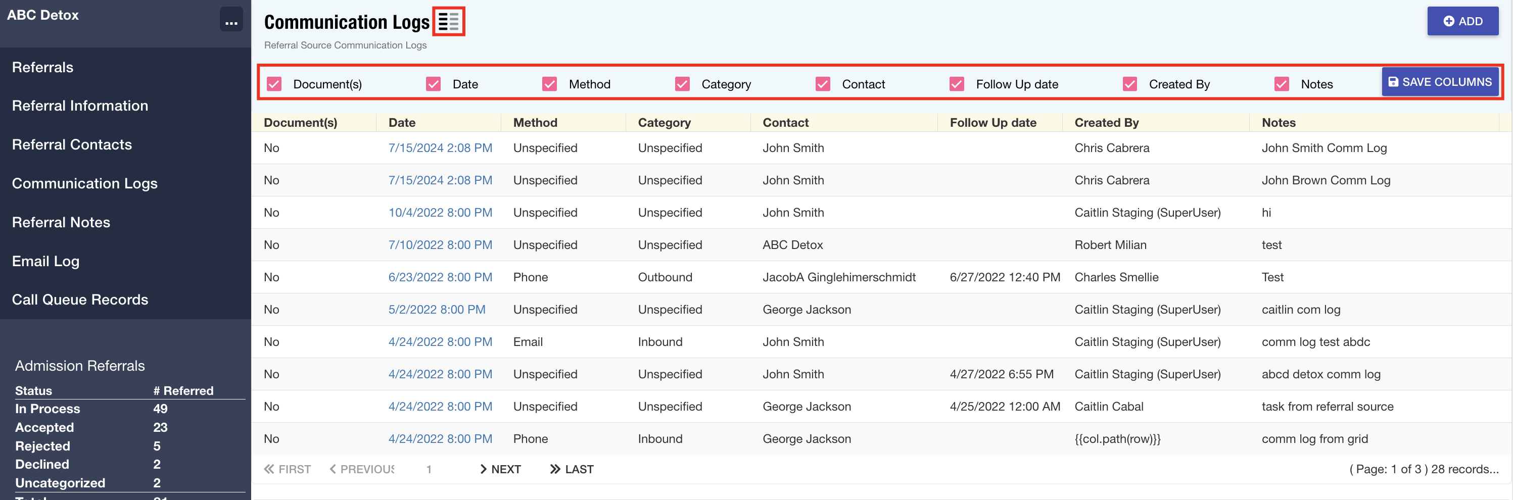 Referral Sources: The Communication Logs section in Referral Source records has been updated to include show/hide functionality, giving users the ability to customize which columns are displayed. This enhancement offers increased control and flexibility over how information is presented in this area.