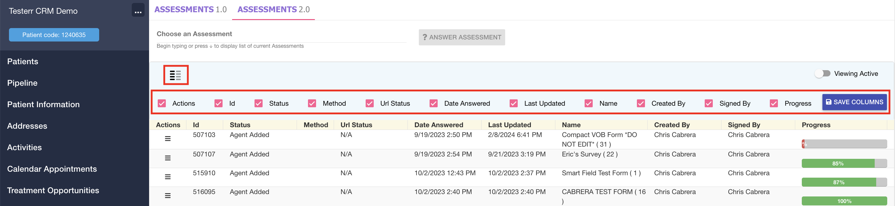 Patient Records: The Assessments area of the patient record has been updated to include show/hide functionality, giving users the ability to customize which columns are displayed. This enhancement offers increased control and flexibility over how information is presented in this area.