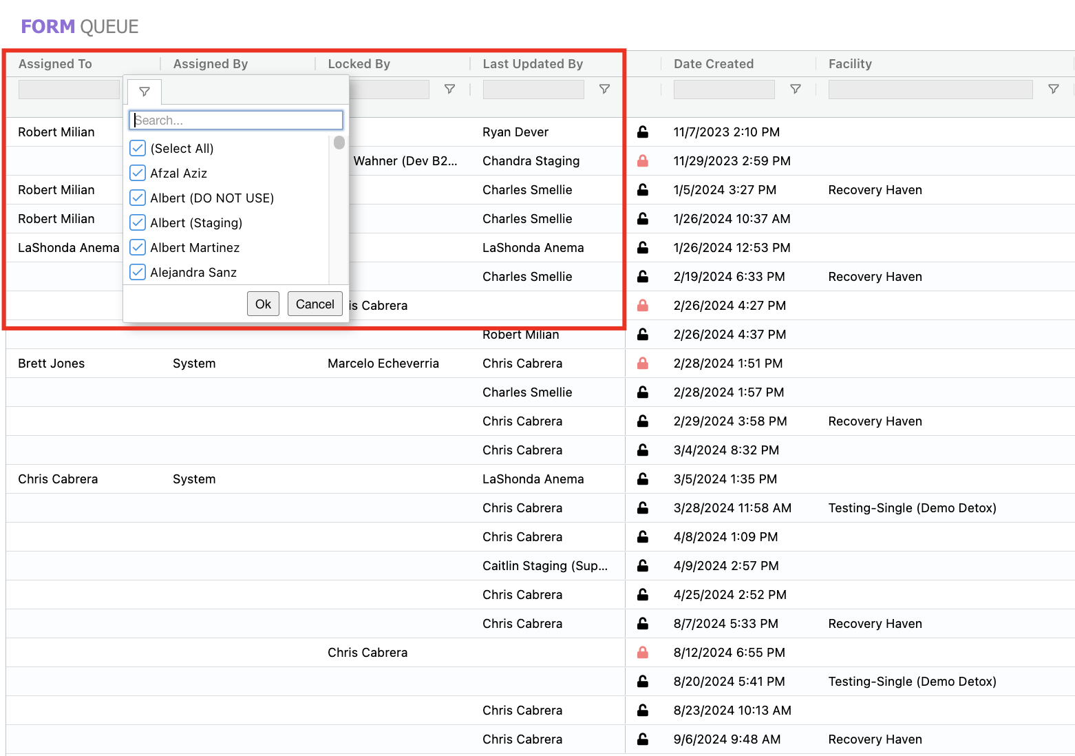 Form Queue: The Assigned To, Assigned By, Locked By, and Last Updated By columns in the Form Queue grid have been enhanced with multi-select control filtering. This update enables users to filter form records more efficiently by selecting multiple criteria in the columns.