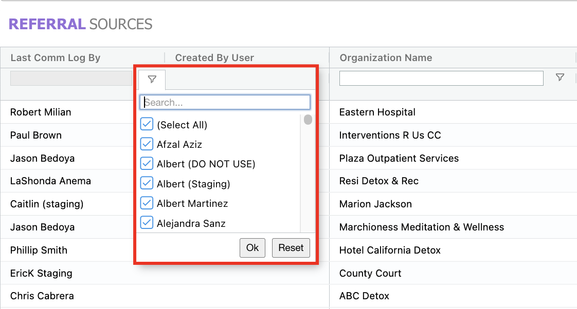 Referral Sources: The “Last Comm Log By” and “Created By User” columns in the Referral Source grid now support multi-select filtering. This enhancement allows users to filter referral source records more efficiently by selecting multiple criteria in the columns.