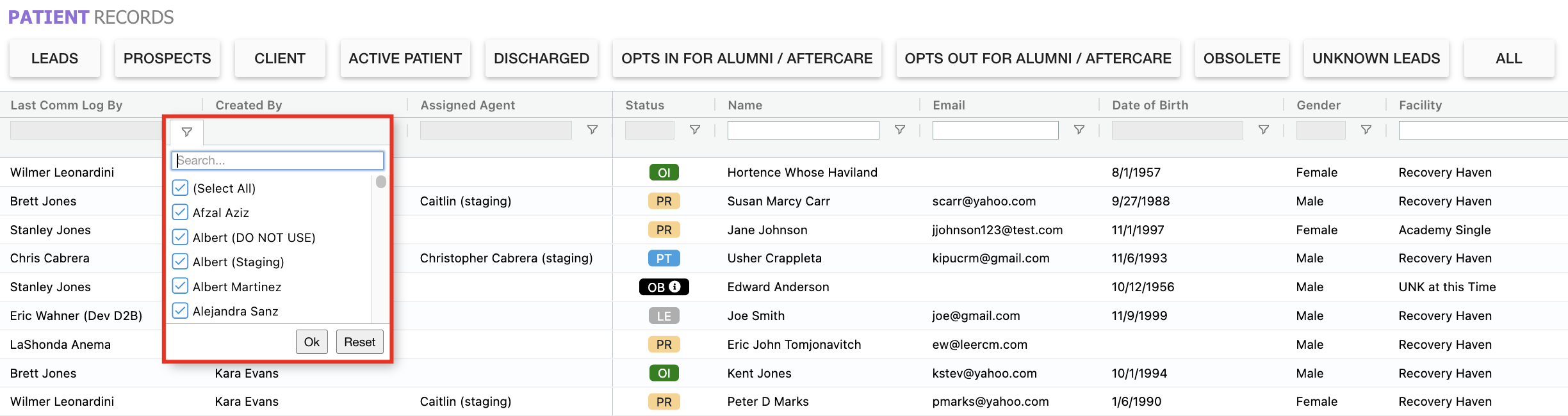 Patient Records Grid: The “Last Comm Log By,” “Created By,” and “Assigned Agent” columns in the Prospect/Patient Records grid now support multi-select filtering. This enhancement enables users to filter Prospect/Patient records more efficiently by selecting multiple criteria in the columns.