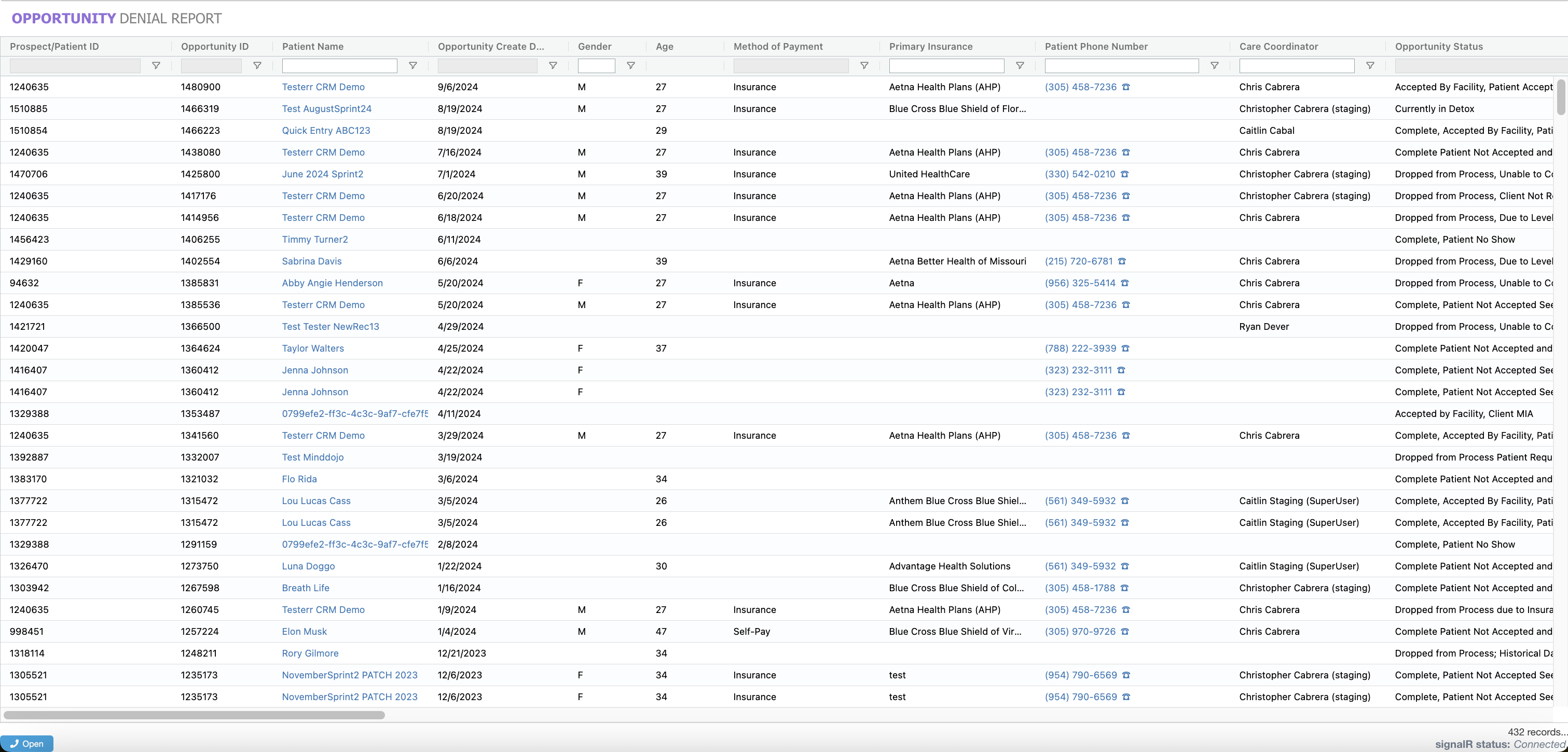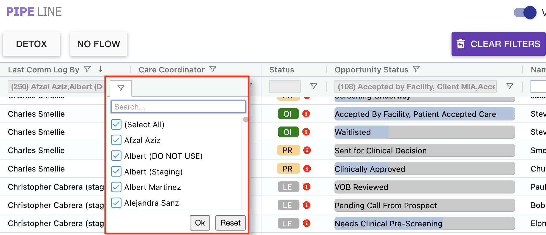 Admissions Pipeline: The “Last Comm Log By" and "Care Coordinator” columns in the Admissions Pipeline grid now support multi-select filtering. This enhancement allows users to filter opportunity records more efficiently by selecting multiple criteria in the columns.
