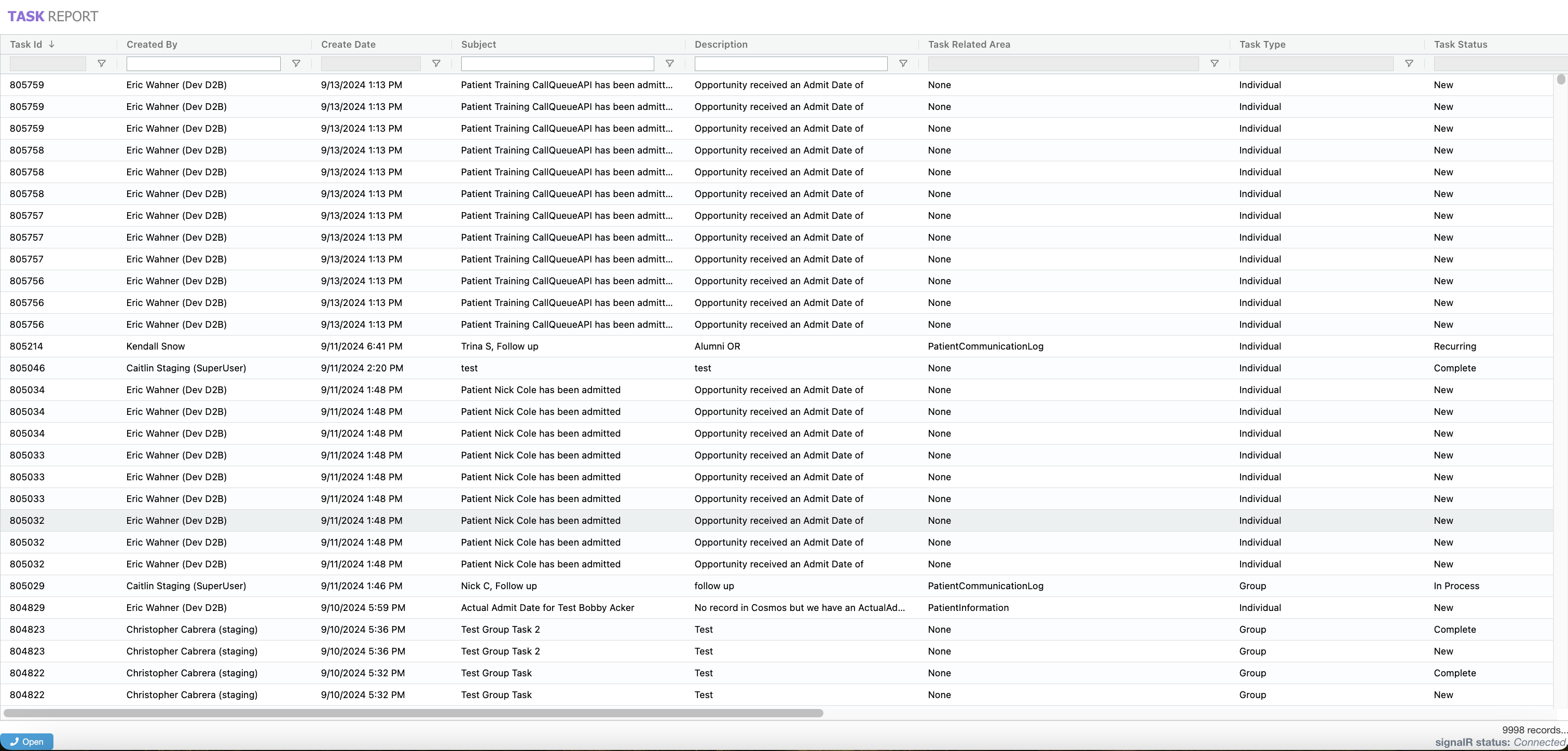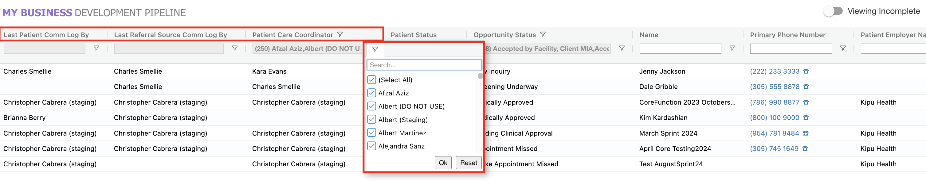 My BD Pipeline: The columns on the My BD Pipeline grid—Last Patient Comm Log By, Last Referral Source Comm Log By, and Patient Care Coordinator—have been updated to support multi-select control filtering. This enhancement allows users to filter their records more efficiently by selecting multiple criteria in the columns.