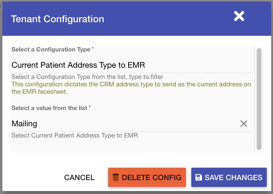 CRM Configurations: A new configuration allows Super Users to control the cascading order in which patient addresses are sent to the EMR, based on address type (Billing, Mailing, Physical). This enhancement provides greater flexibility in managing address priority during data transfer.