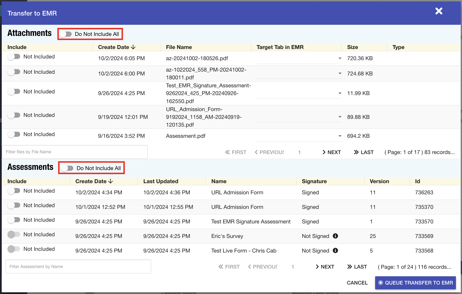 Treatment Opportunities: The Transfer to EMR modal has been enhanced with new toggles, allowing users to quickly select or omit all documents during the transfer process, streamlining the workflow for more efficient document handling.