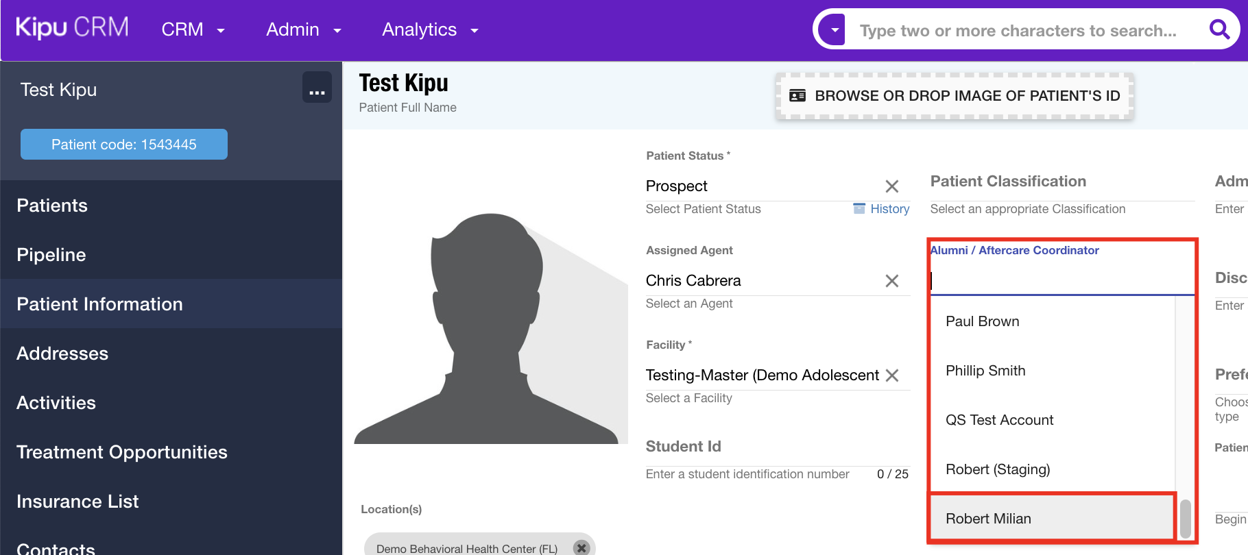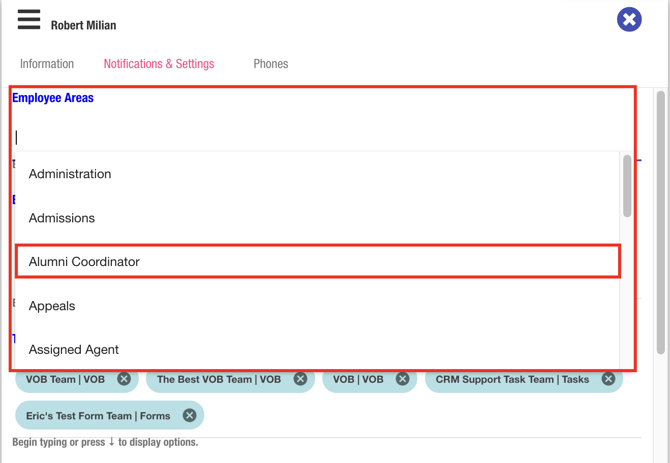 - The user will now appear as an available option for selection on the Alumni Coordinator field.