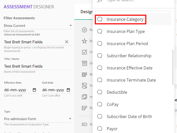 To add Smart Fields into the Assessment Designer, follow the steps below: