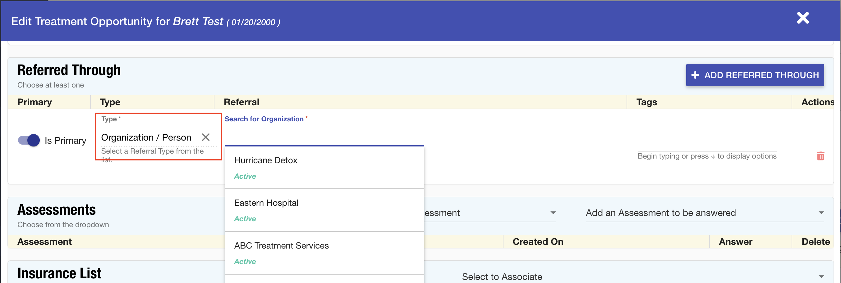 - On the next screen, scroll down to the Referred-Through section and, under the "Referred-Through" tab, select Organization/Person instead of Facility. This selection will enable you to search for and add the appropriate referral source.