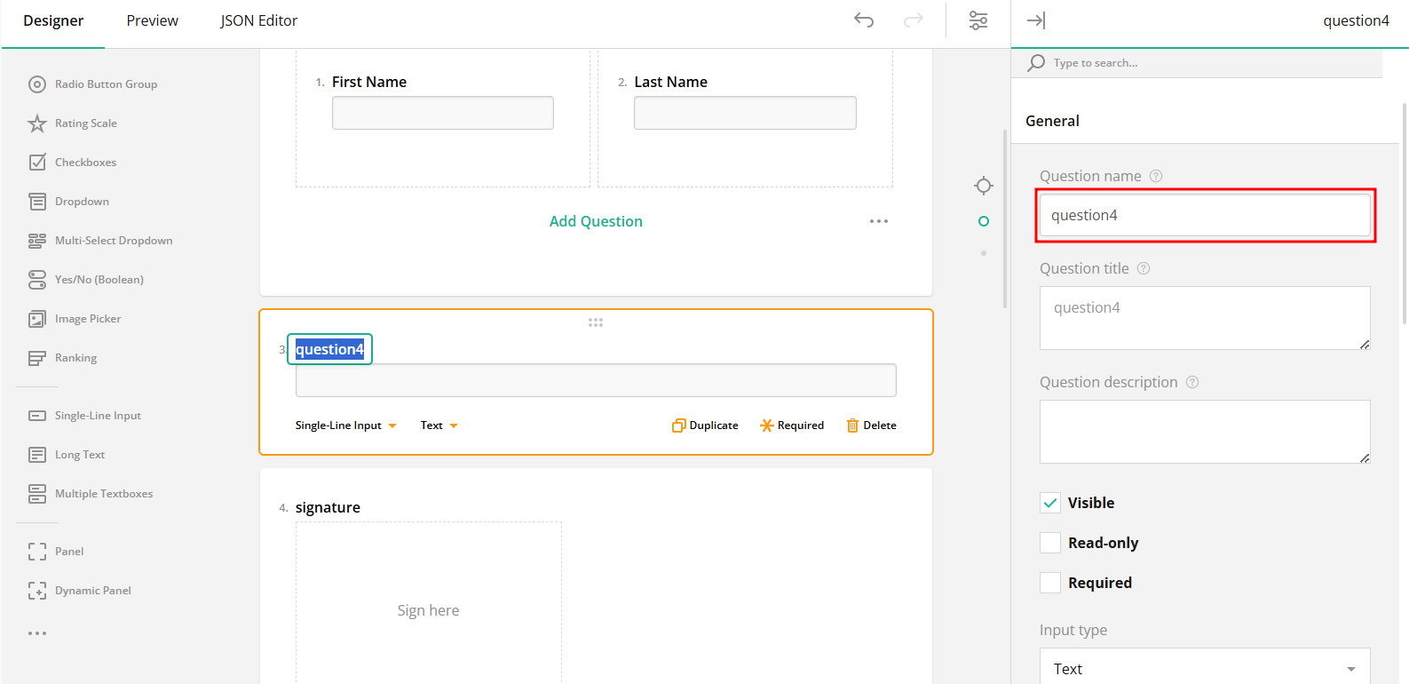 - Enter a desired Question Name in the General panel on the right-hand side of the screen.
