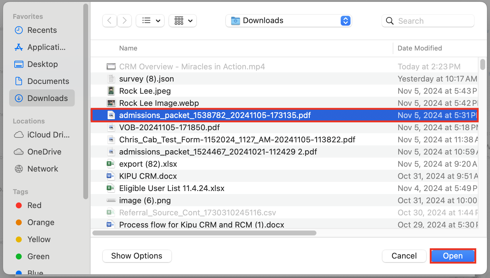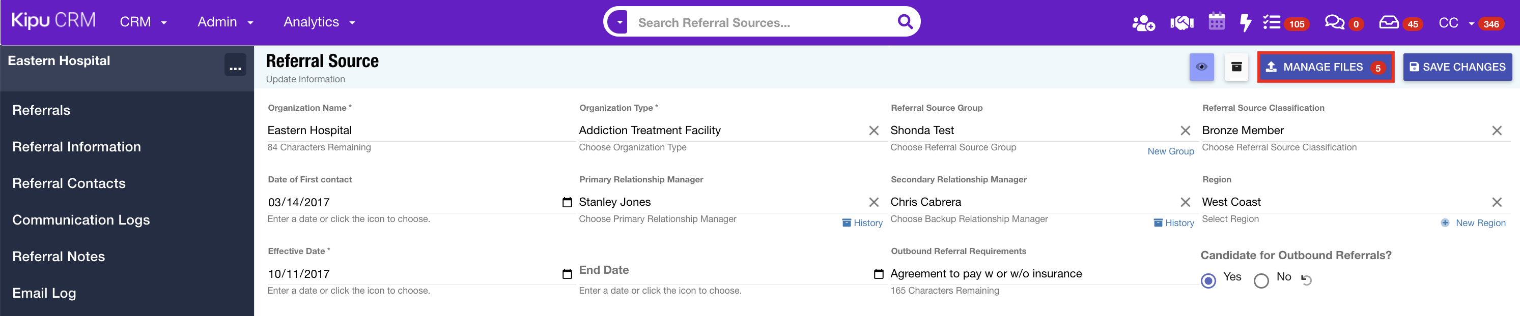 You can upload a document to a referral source record by using the Manage Files area on the Information page.