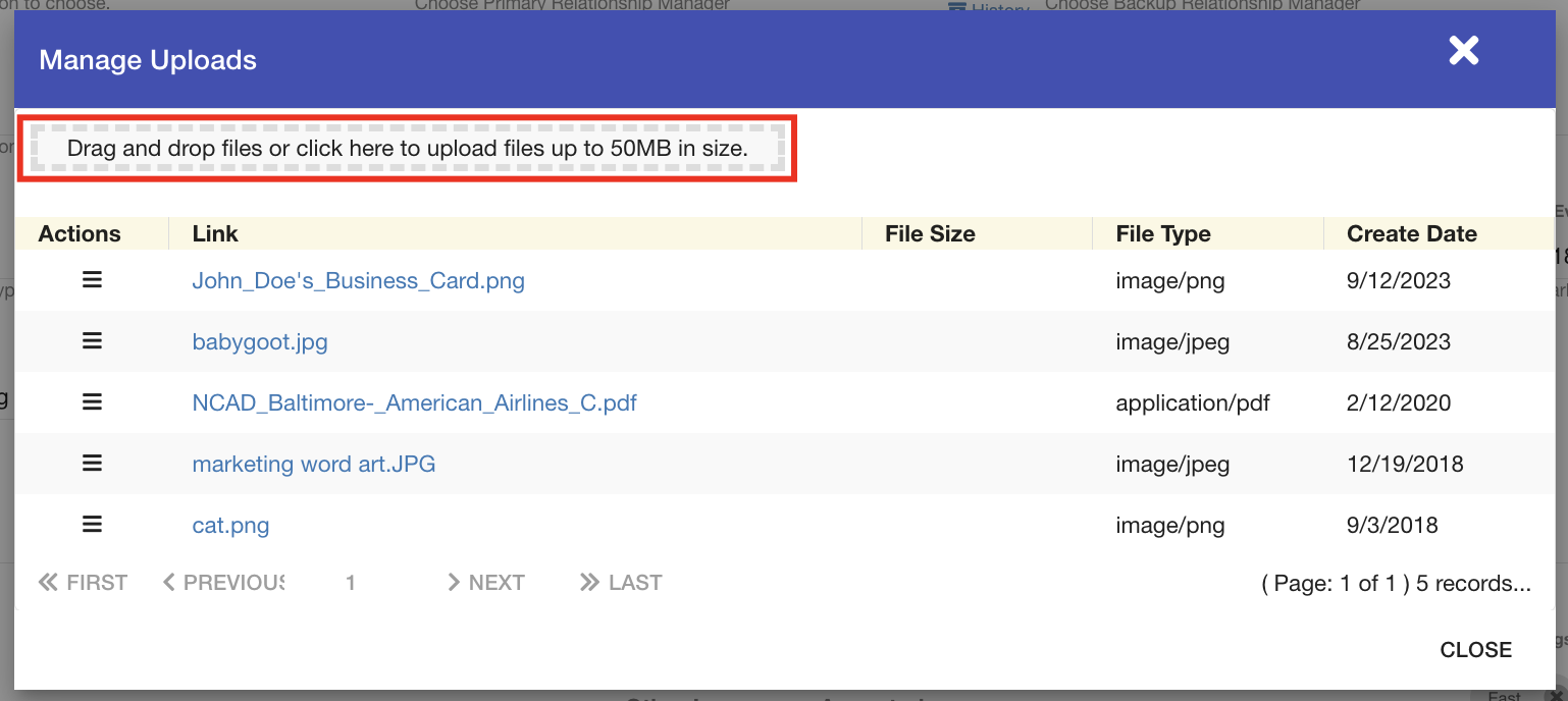 - In the manage files area, drag and drop a file from your computer to the highlighted area or click on it to search for and upload files.