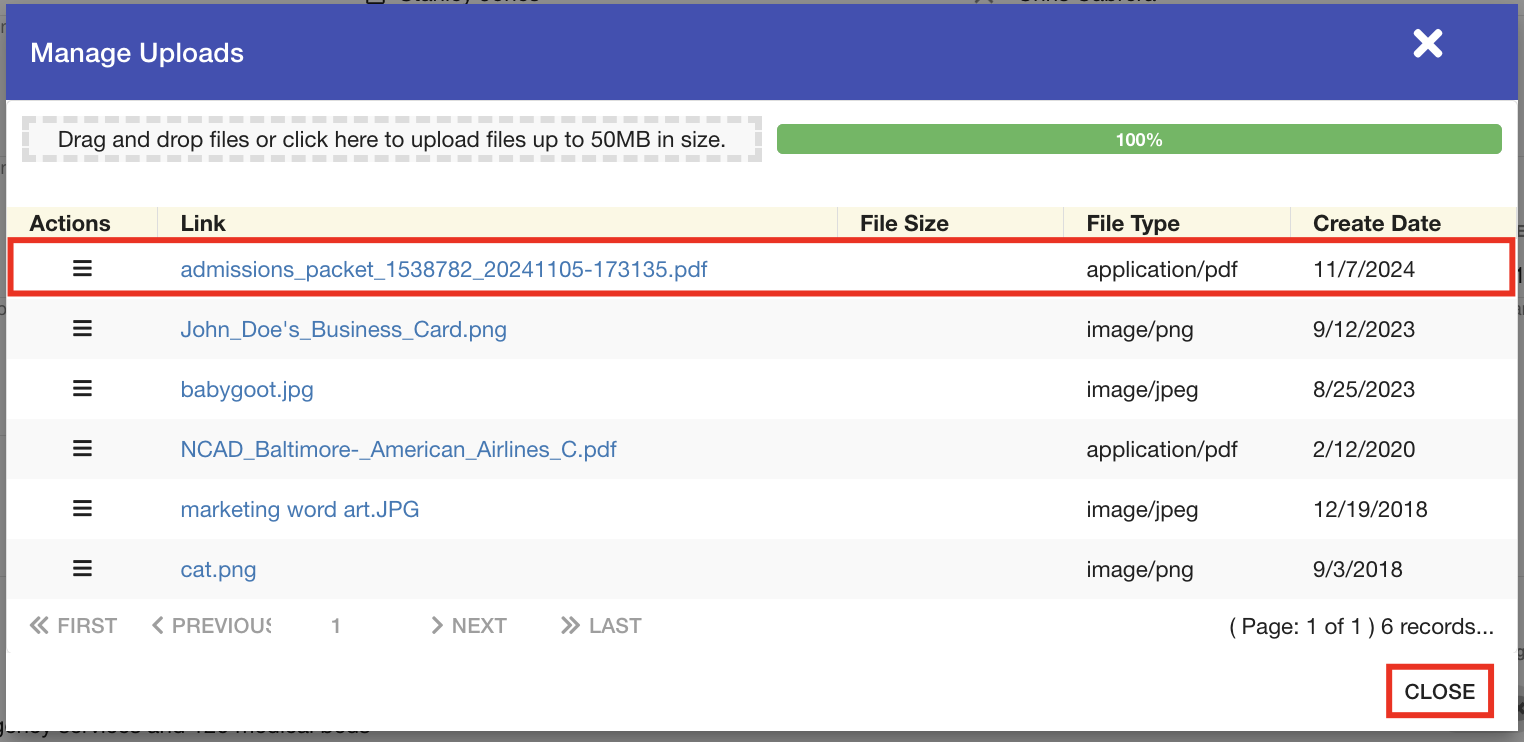 - The file will be successfully uploaded to the Referral Source record. Once confirmed, select Close.