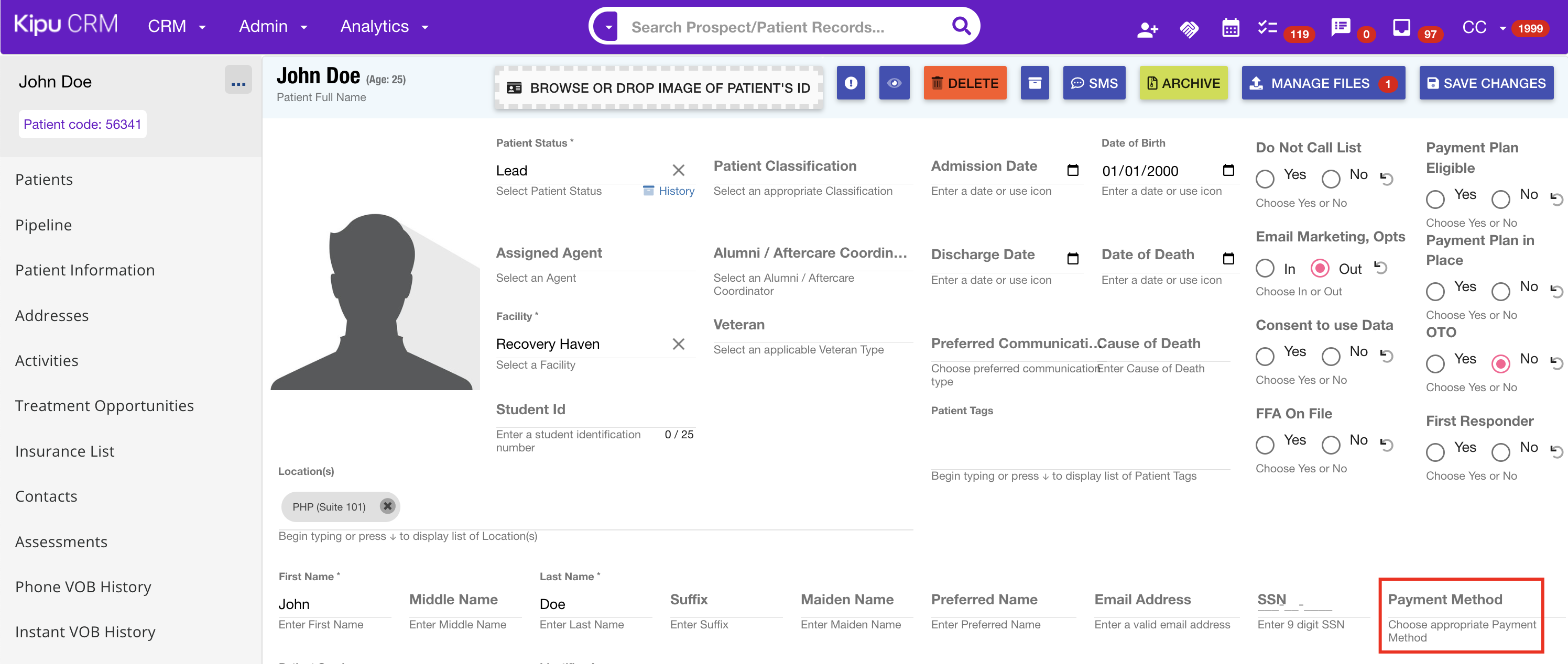 Patient Records: The Method of Payment field in the patient information section of the record has been renamed to Payment Method to ensure greater uniformity across the Kipu ecosystem of products.