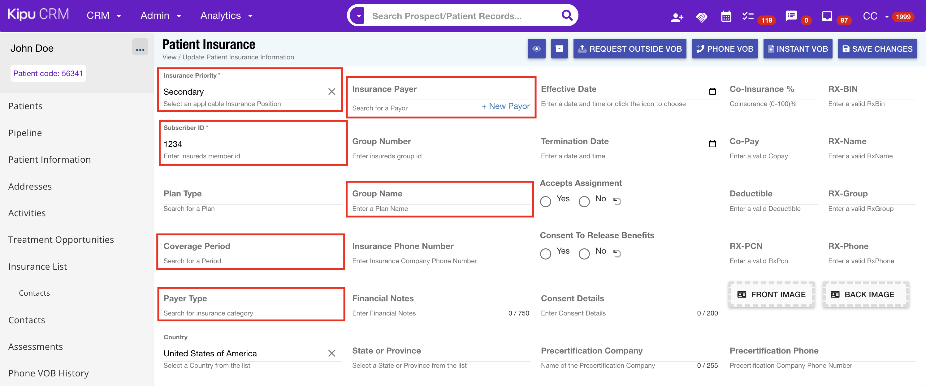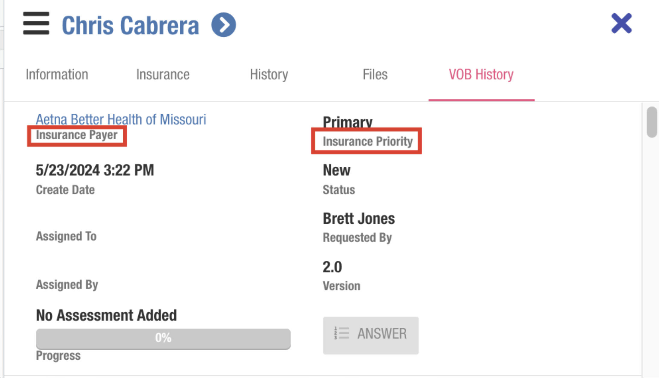 VOB 2.0: The insurance-related fields within the VOB 2.0 focus panel have been updated to align with the newly implemented patient insurance field labels, ensuring consistency and uniformity across the system.