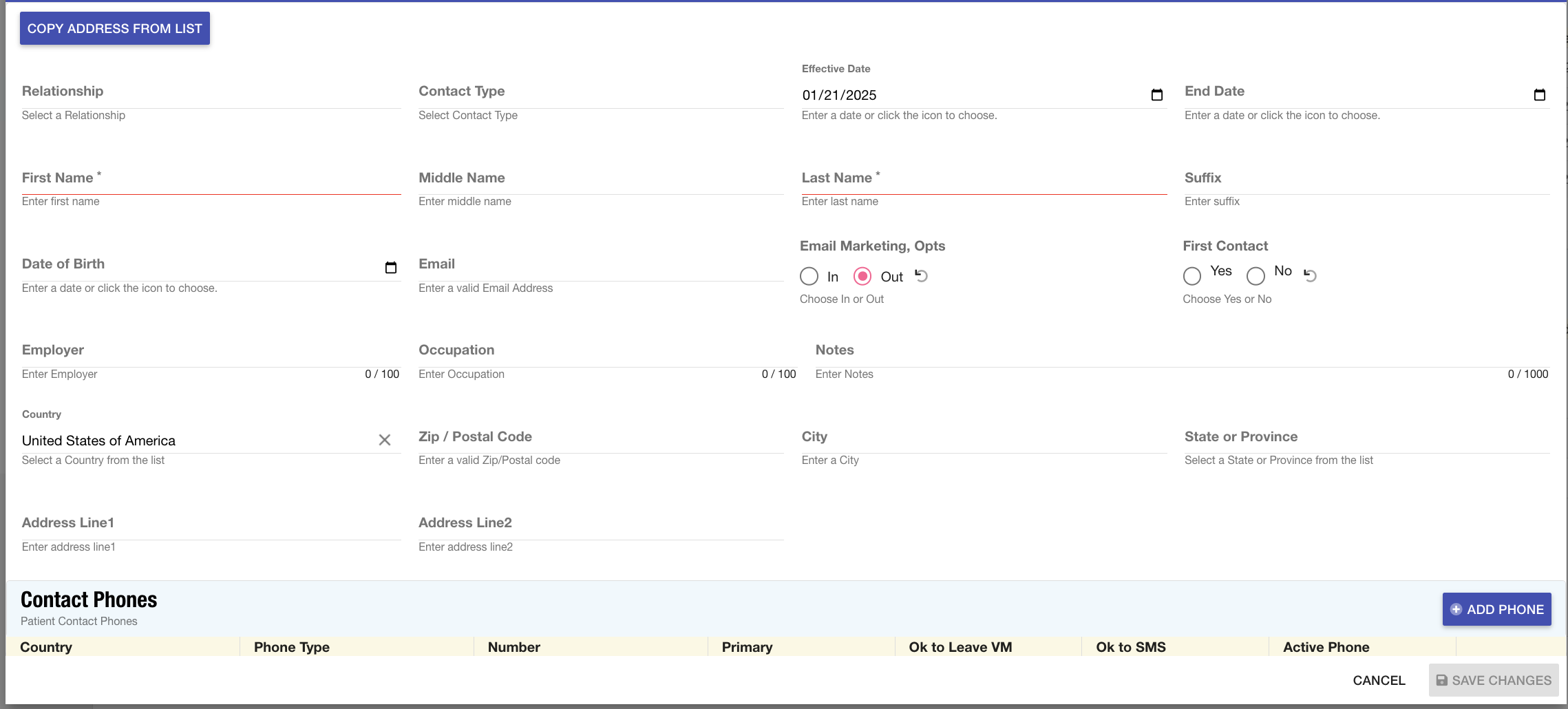 Patient Contact Records: The user interface for the Patient Address record has been updated to enhance its intuitiveness and improve its overall appearance within the site.
