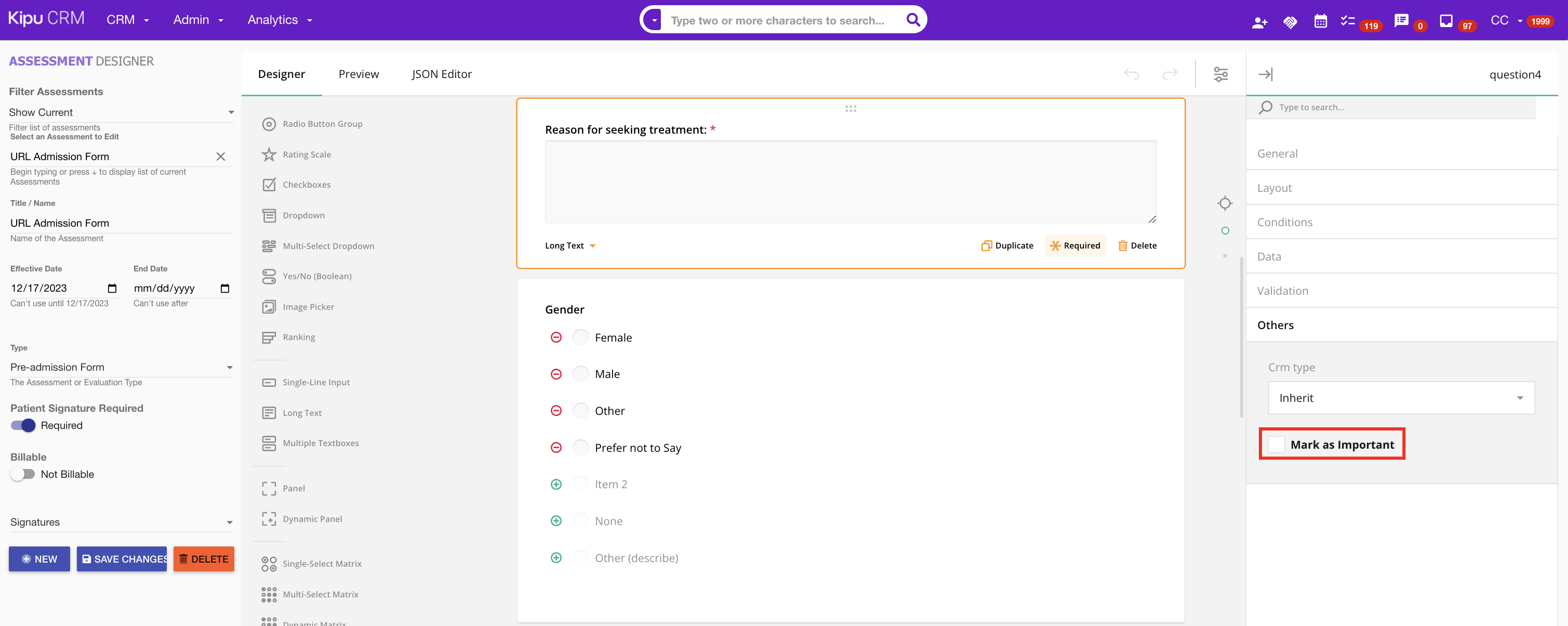 Assessments Designer: The Assessment Designer application has been enhanced to allow users to mark specific fields as important. When marked, these fields will be highlighted with a red line while working on the assessment, ensuring they stand out for improved visibility and prioritization.