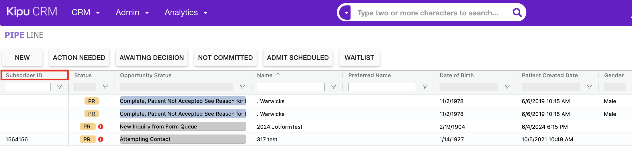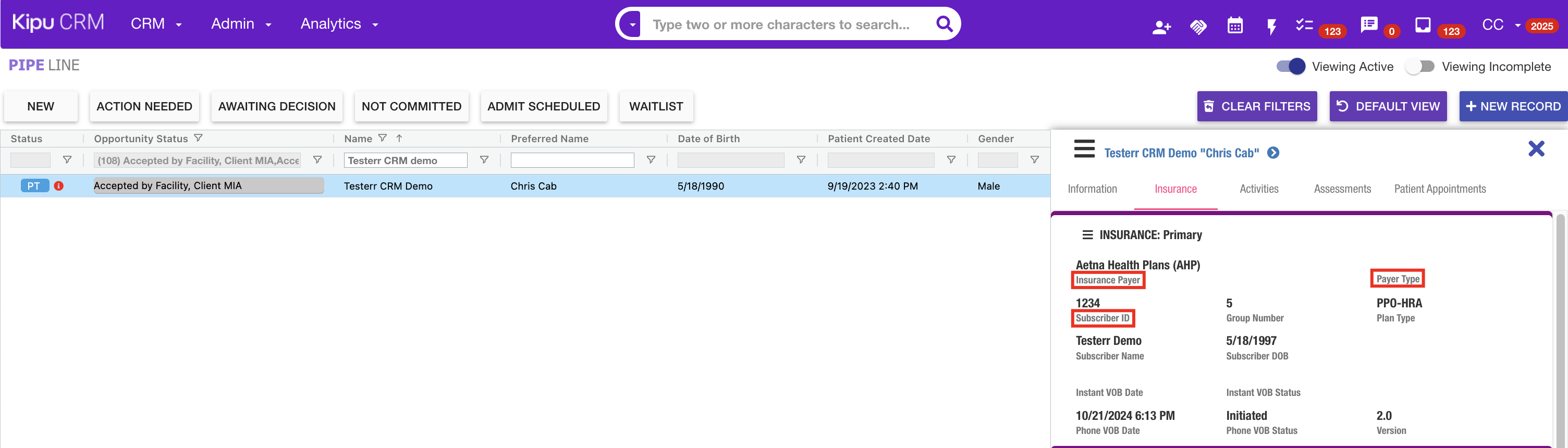 Admissions Pipeline: The insurance-related field on the admissions pipeline grid have been updated to align with the newly implemented patient insurance field labels, ensuring consistency and uniformity across the system.