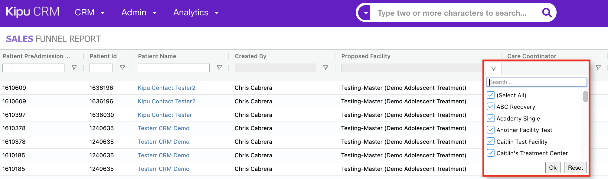 Analytics: The Proposed Facility column in the Sales Funnel report now supports multi-select control filtering, allowing users to refine and analyze data more efficiently.