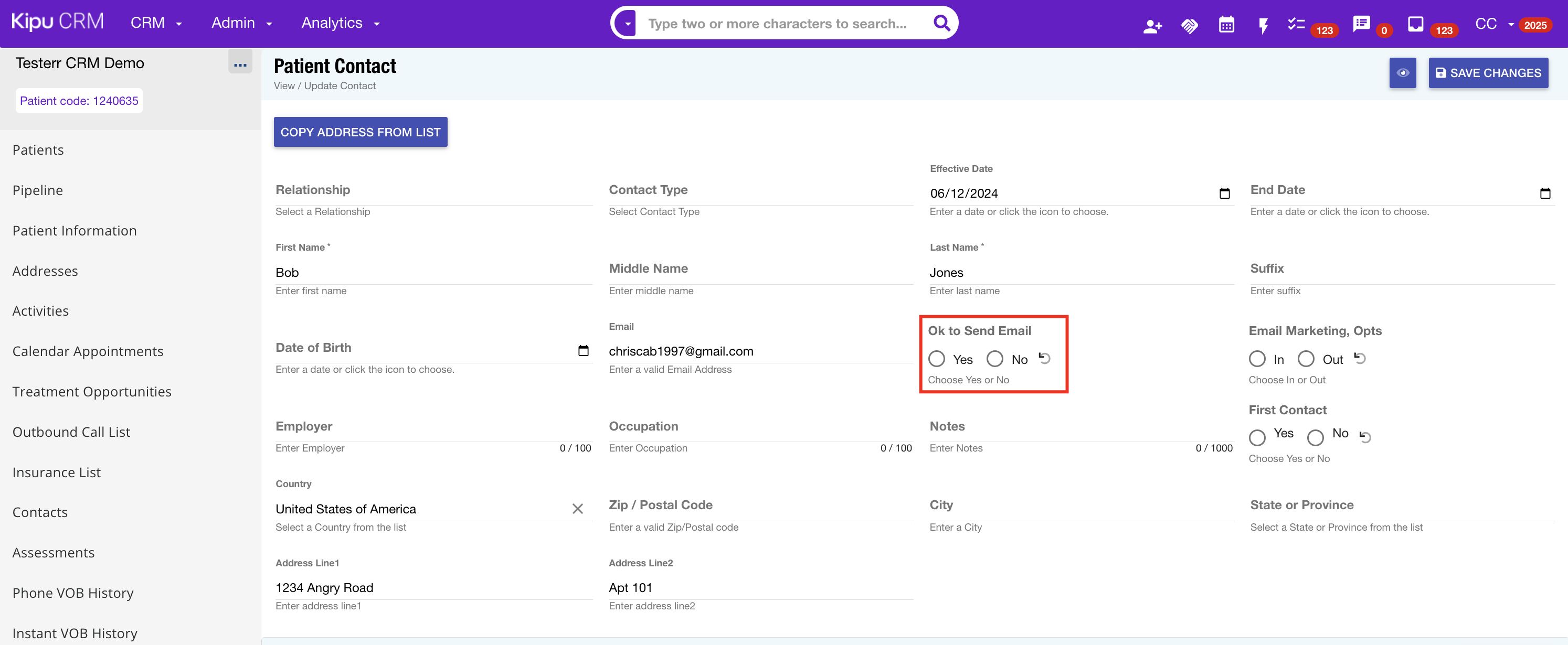 Patient Contacts: The Patient Contact screen has been updated with a new field, “Ok to Send Email,” which controls whether email communications can be sent to the patient contact via Kipu CRM.