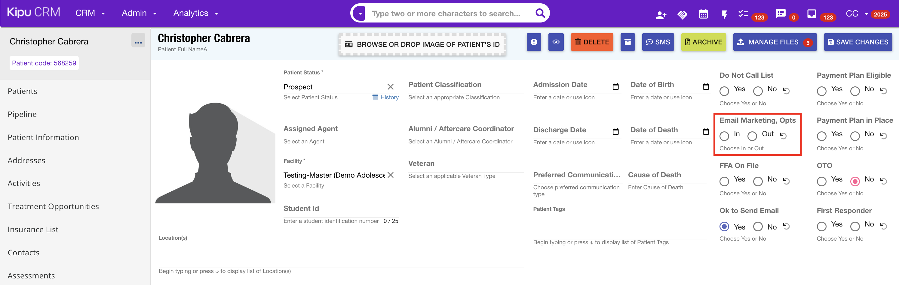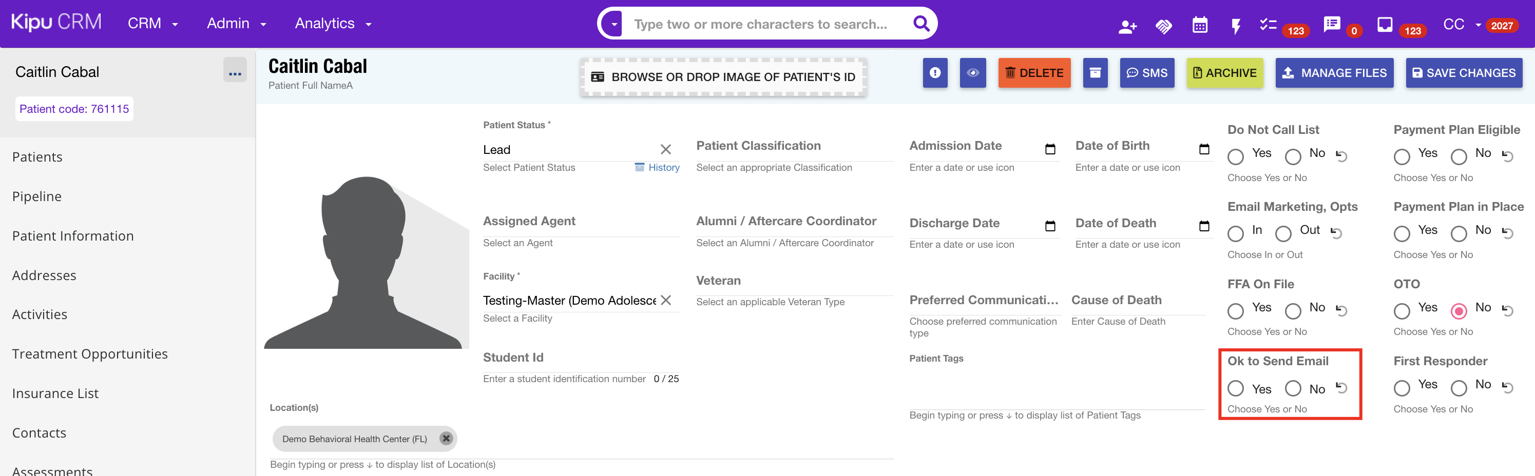 Patient Records: The Patient Information screen has been updated with a new field, “Ok to Send Email,” which determines whether email communications can be sent to the patient via Kipu CRM.