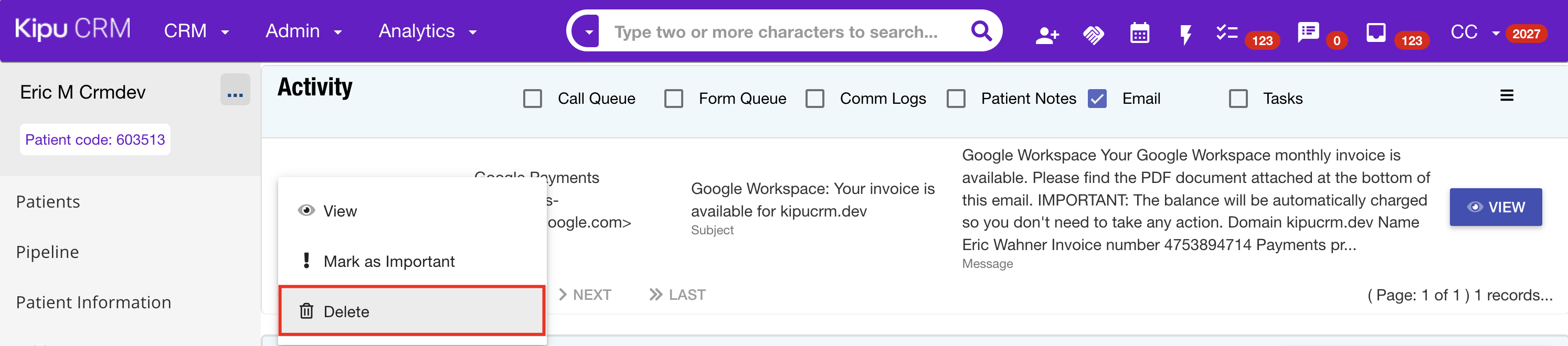 Patient Records: The Activities section within patient records has been enhanced to allow users to delete email log records, providing greater control over the email correspondences stored within patient records.