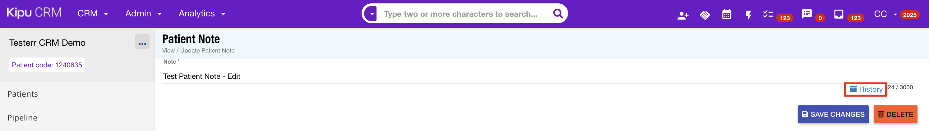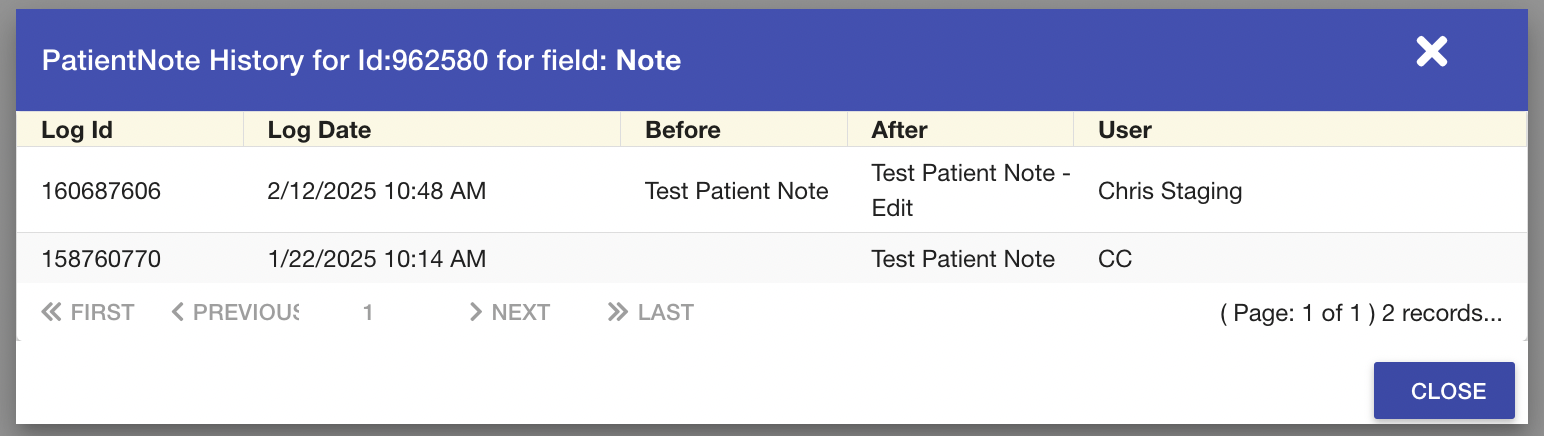 Patient Notes: Patient Note records have been enhanced with an audit log, enabling users to track and view exact changes made to notes for improved transparency and record-keeping.