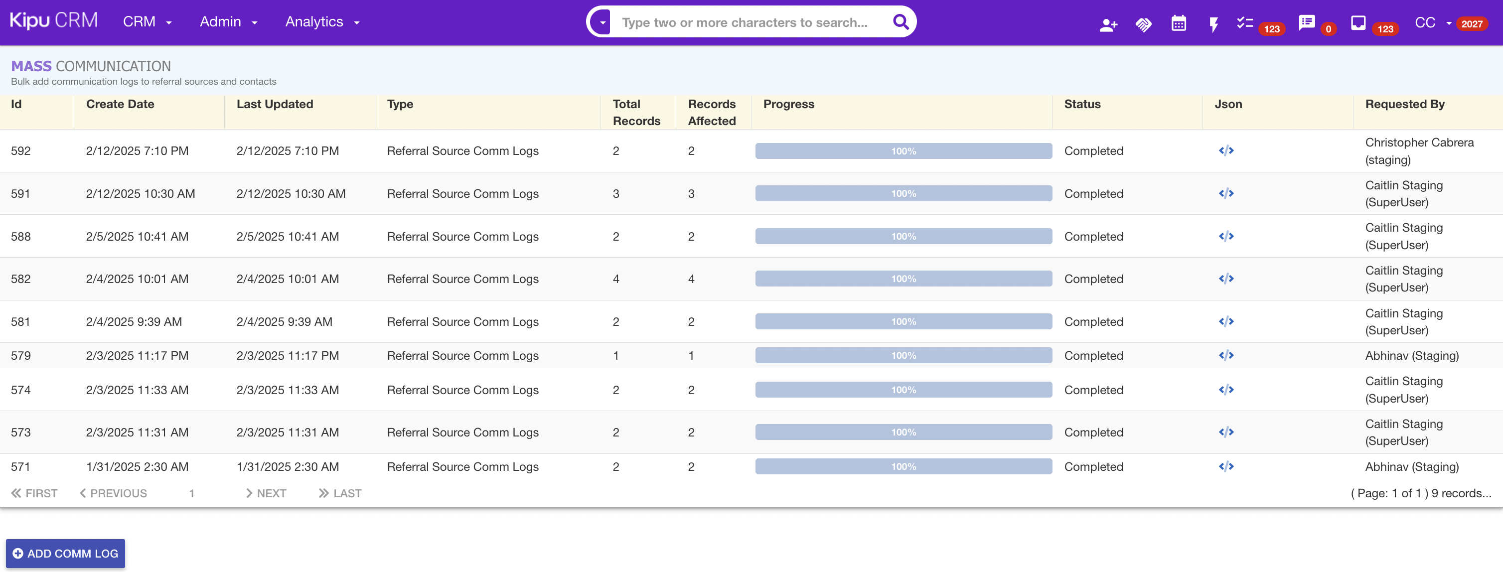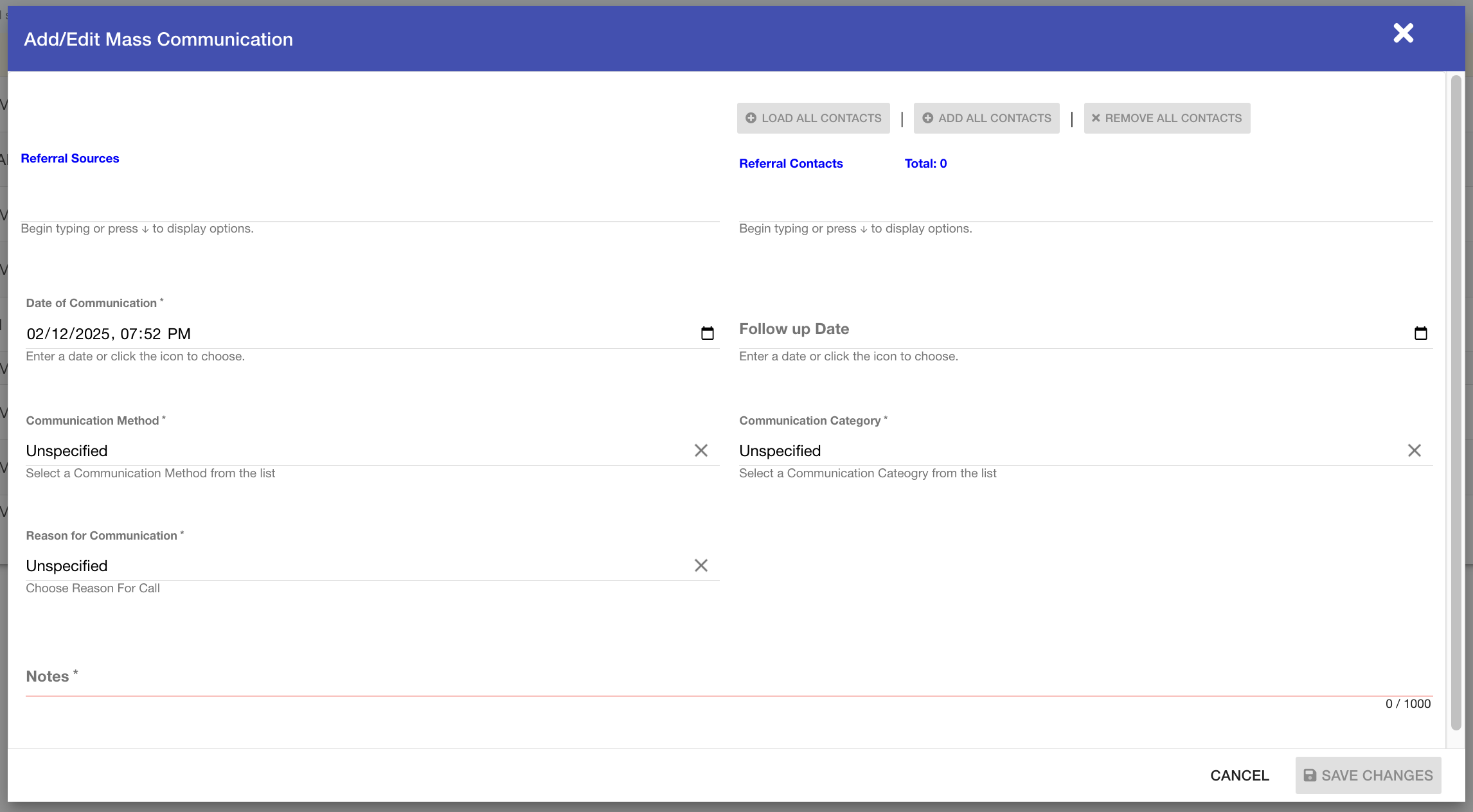 Referral Source Communication Logs: A new feature, “Mass Communication,” has been released, enabling users to bulk add referral source communication logs across multiple records in the system from a single interface, streamlining documentation and communication tracking.
