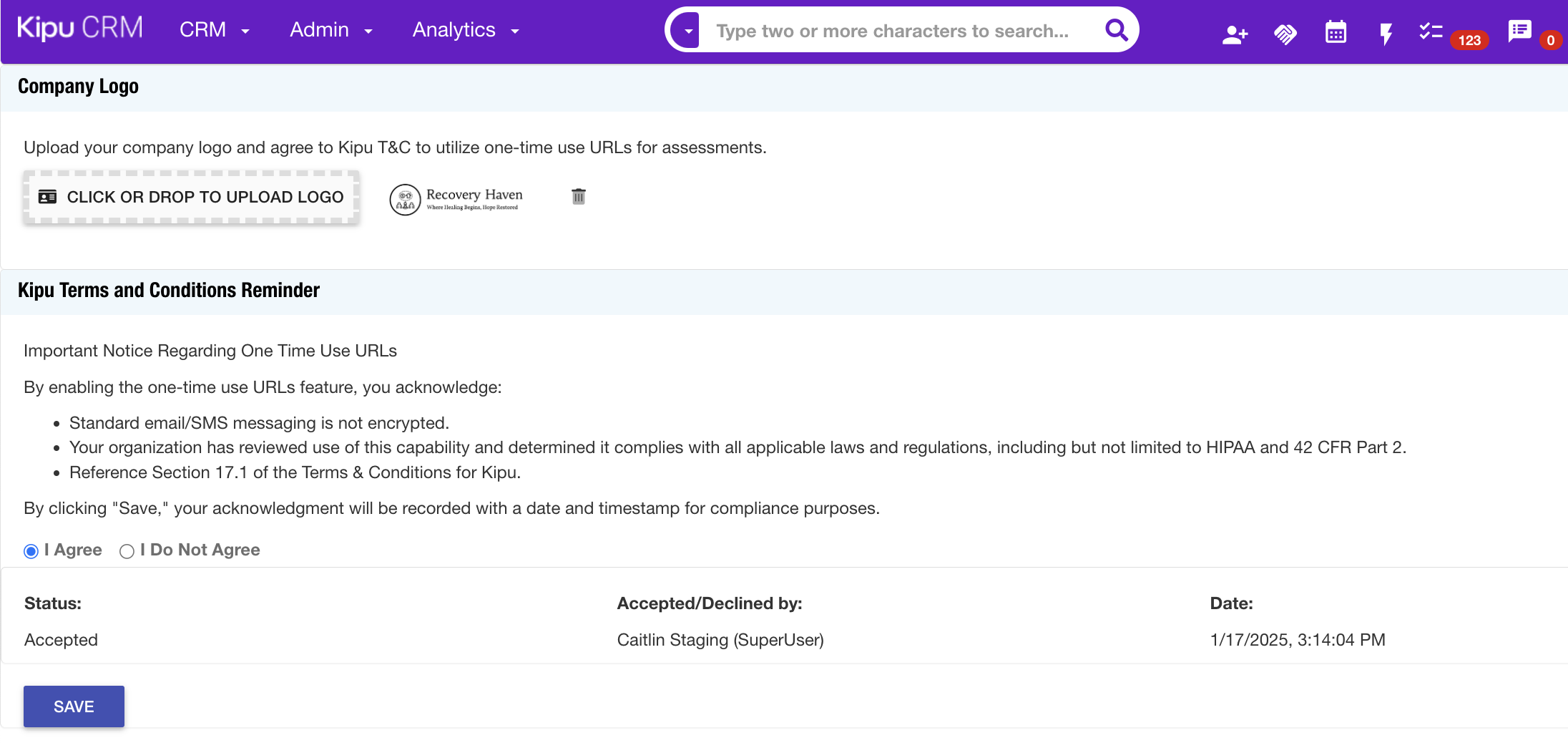 Referral Source Contacts: The Referral Source Contact screen has been updated with a new field, “Ok to Send Email,” which determines whether email communications can be sent to the patient via Kipu CRM.