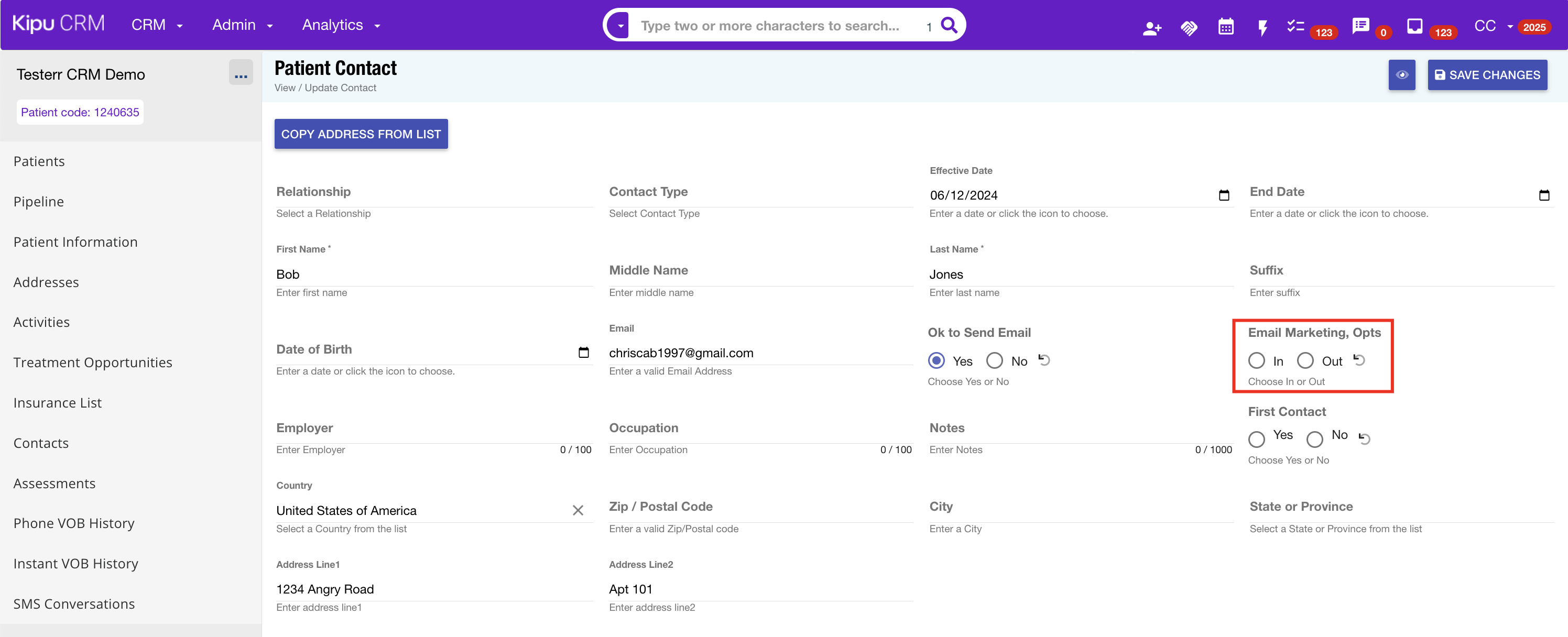 Patient Contacts: The Patient Contact screen has been updated with a new field, “Email Marketing Opts,” to support email marketing integrations. If a Patient Contact is set to “Opts In,” the record will be added to the email marketing list. If set to “Opts Out,” the record will be excluded, ensuring proper consent management.