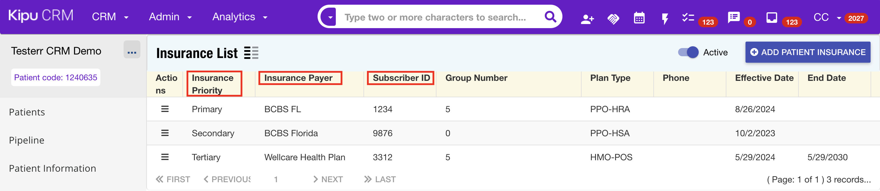 Patient Records Grid: The insurance-related field in the patient records grid has been updated to align with the newly implemented patient insurance field labels, ensuring consistency and uniformity across the system.