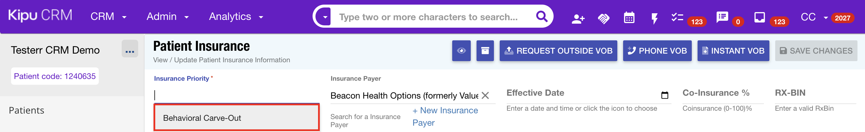 Patient Insurance Records: The Insurance Priority option “Carve Out” has been updated to “Behavioral Carve-Out” to align with the standardized product labels used across the Kipu Health ecosystem.