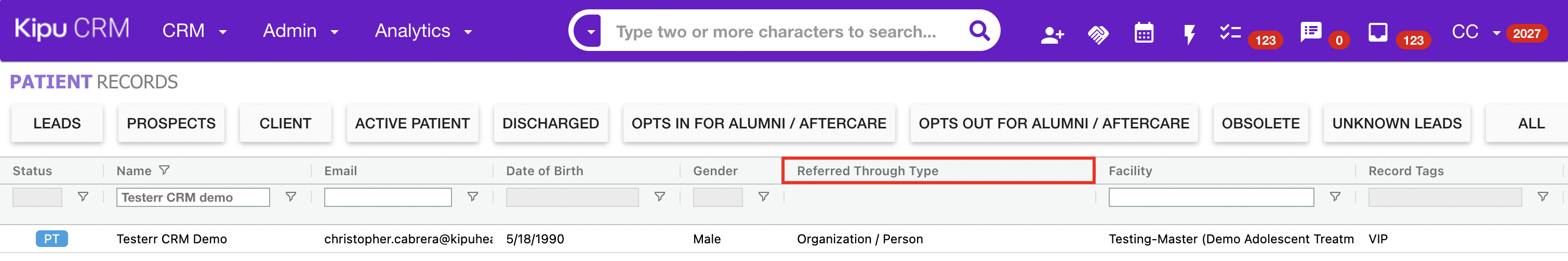 Patient Records Grid: The Patient Records grid now includes a new column, “Referred Through Type,” which displays the referred through type from the most recent Treatment Opportunity on file for the patient, providing users with enhanced visibility into referral sources.