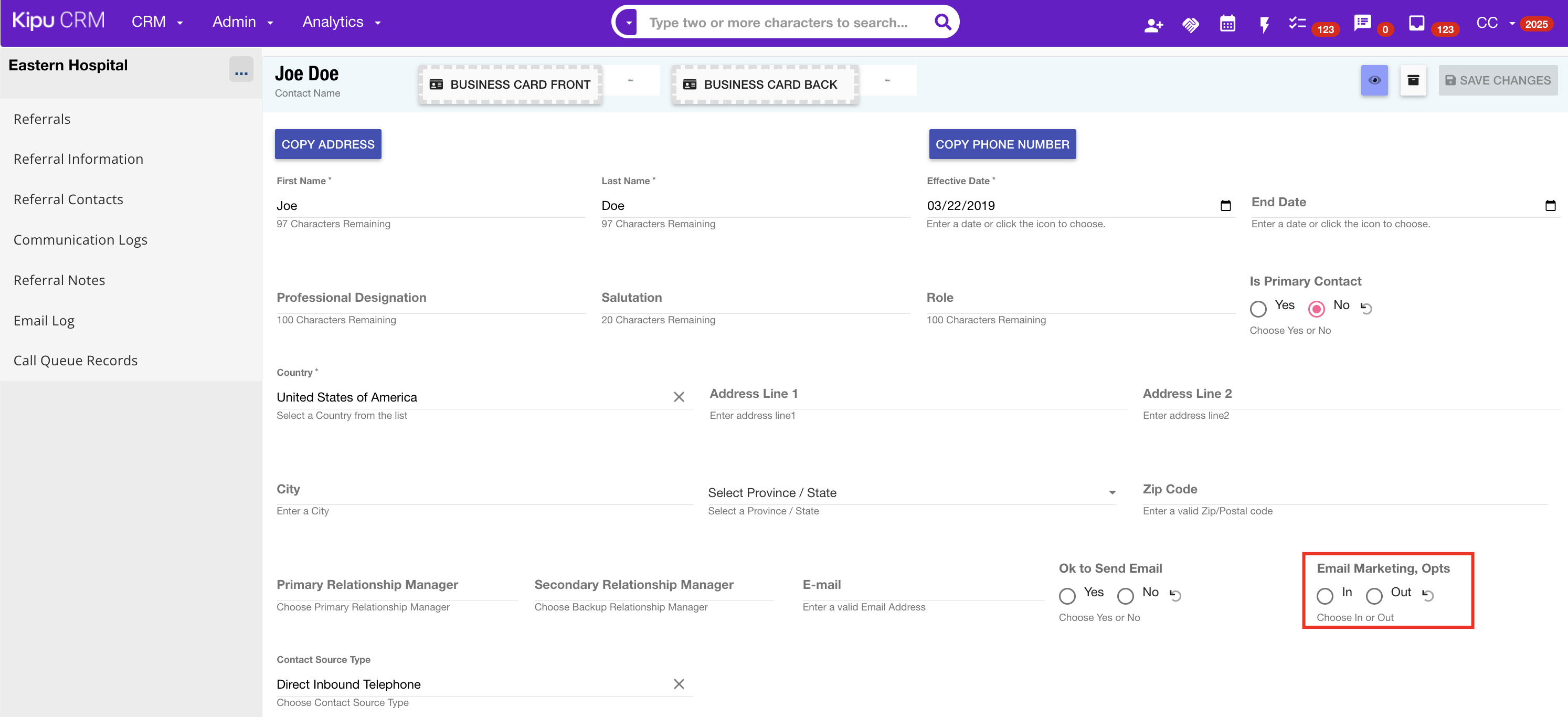 Referral Source Contacts: The Referral Source Contact screen has been updated with a new field, “Email Marketing Opts,” to support email marketing integrations. If a Referral Source Contact is set to “Opts In,” the record will be added to the email marketing list. If set to “Opts Out,” the record will be excluded from the list, ensuring proper consent management.