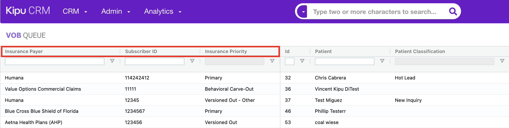 VOB 2.0: The insurance-related columns in the VOB Queue grid have been updated to align with the newly implemented patient insurance field labels, ensuring consistency and uniformity across the system.