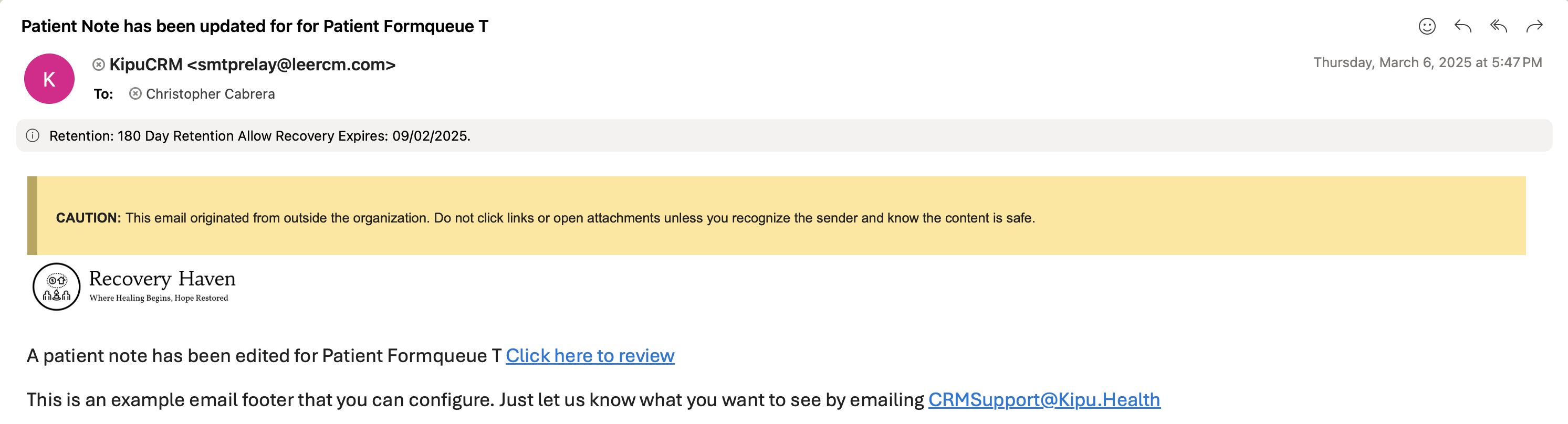 Email Notifications: A new email notification, “Patient Note Update,” has been introduced. This notification alerts subscribed users whenever a patient note is edited within a patient record, ensuring that relevant individuals stay informed about any updates to note documentation in the system.