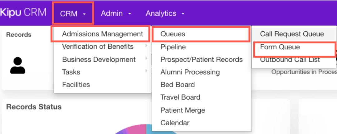 - Navigate to CRM > Admission Management > Queues > Form Queue.