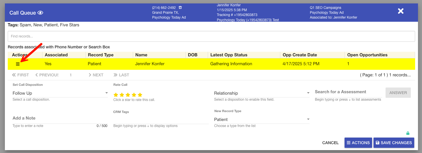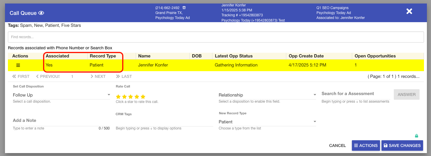 - Before proceeding, confirm that the call queue entry is linked to an existing record with the Record Type set to Patient and the Associated column marked Yes. The column will also turn yellow to confirm the association.