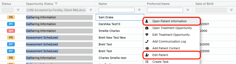 The Admissions Pipeline enables staff to take immediate action directly from the grid. Right-click a patient’s name to access: